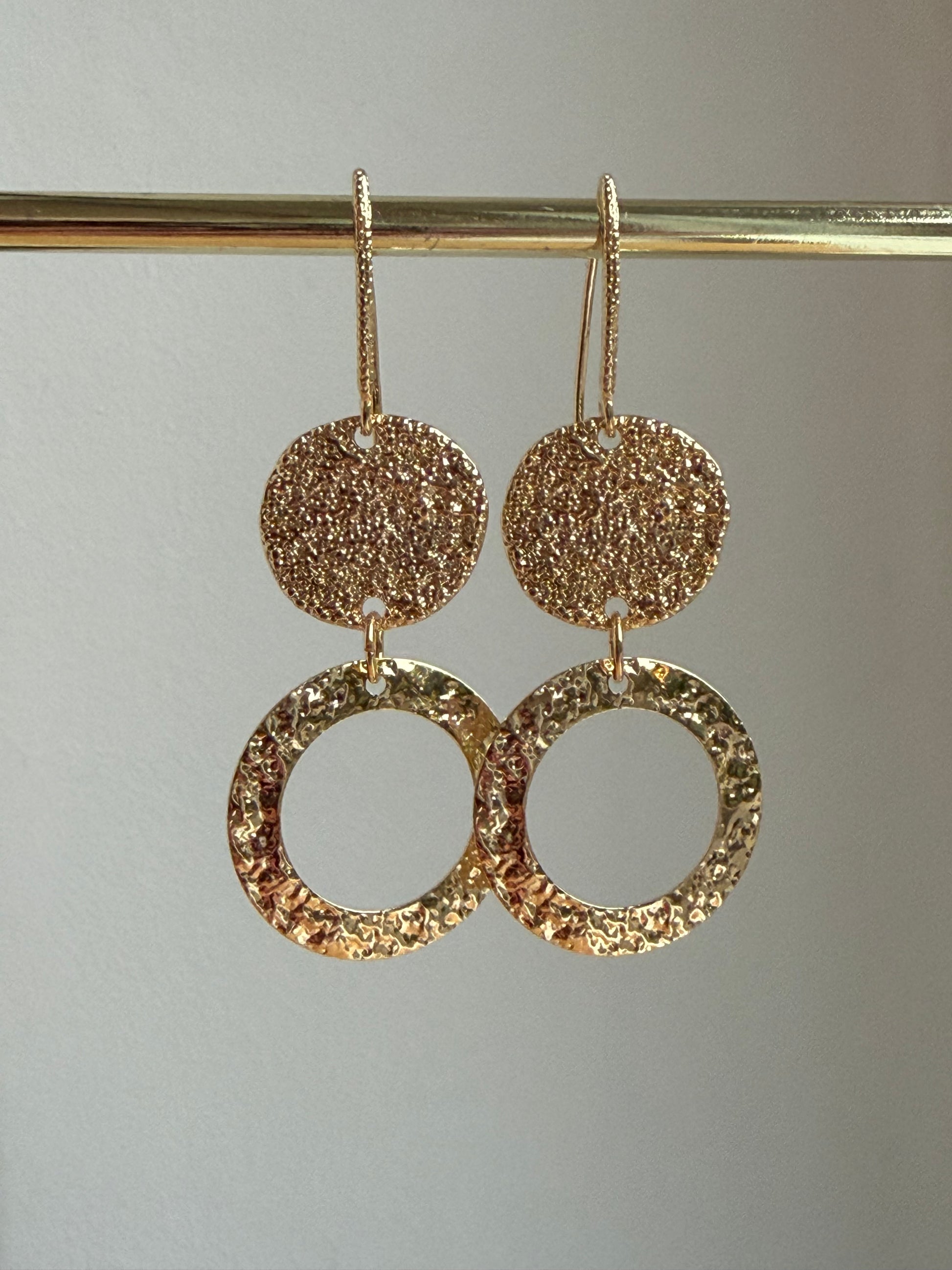 Deze oorbellen hebben het allemaal: een rijke textuur, een speelse vorm en een stijlvolle uitstraling. De combinatie van een ruwe ronde hanger met een gladde ring zorgt voor een spannend contrast.