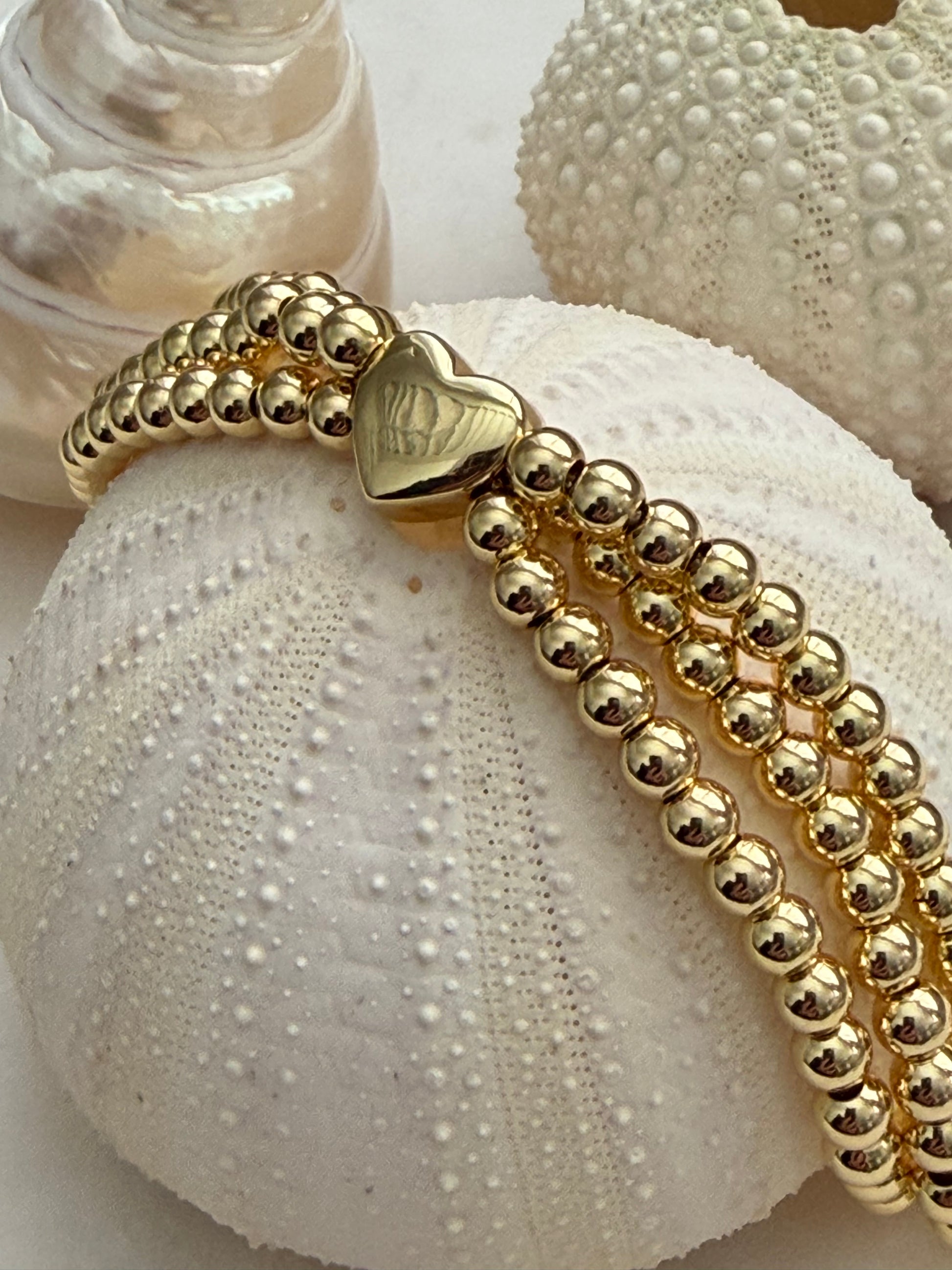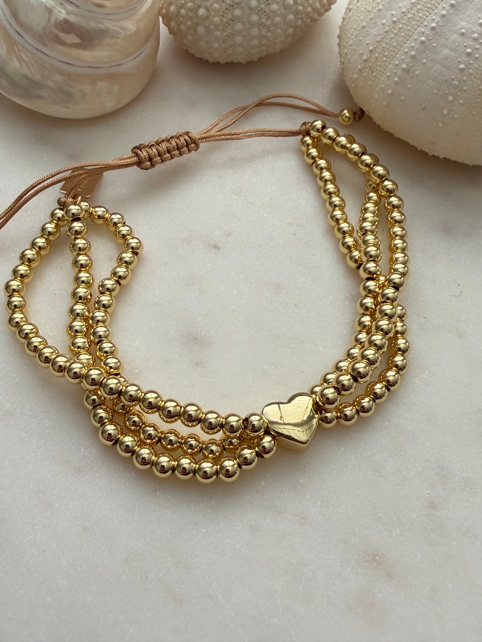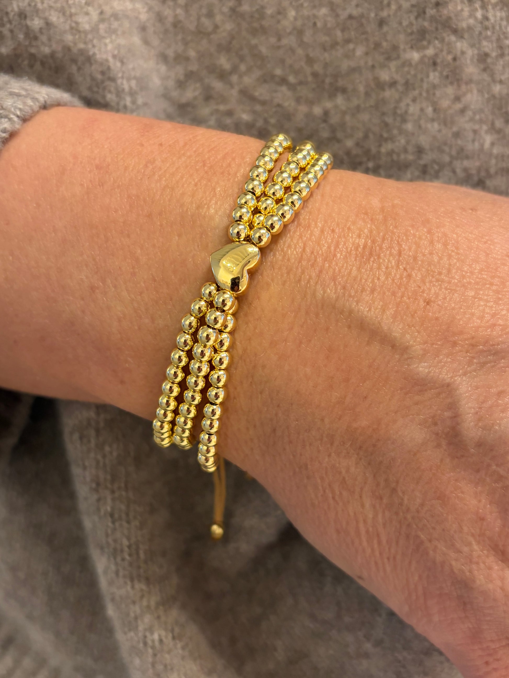 Prachtige gold-filled armband bestaande uit 3 armbandjes van 4 mm kralen met een hartje. Sluiting is dmv trekkoordje.