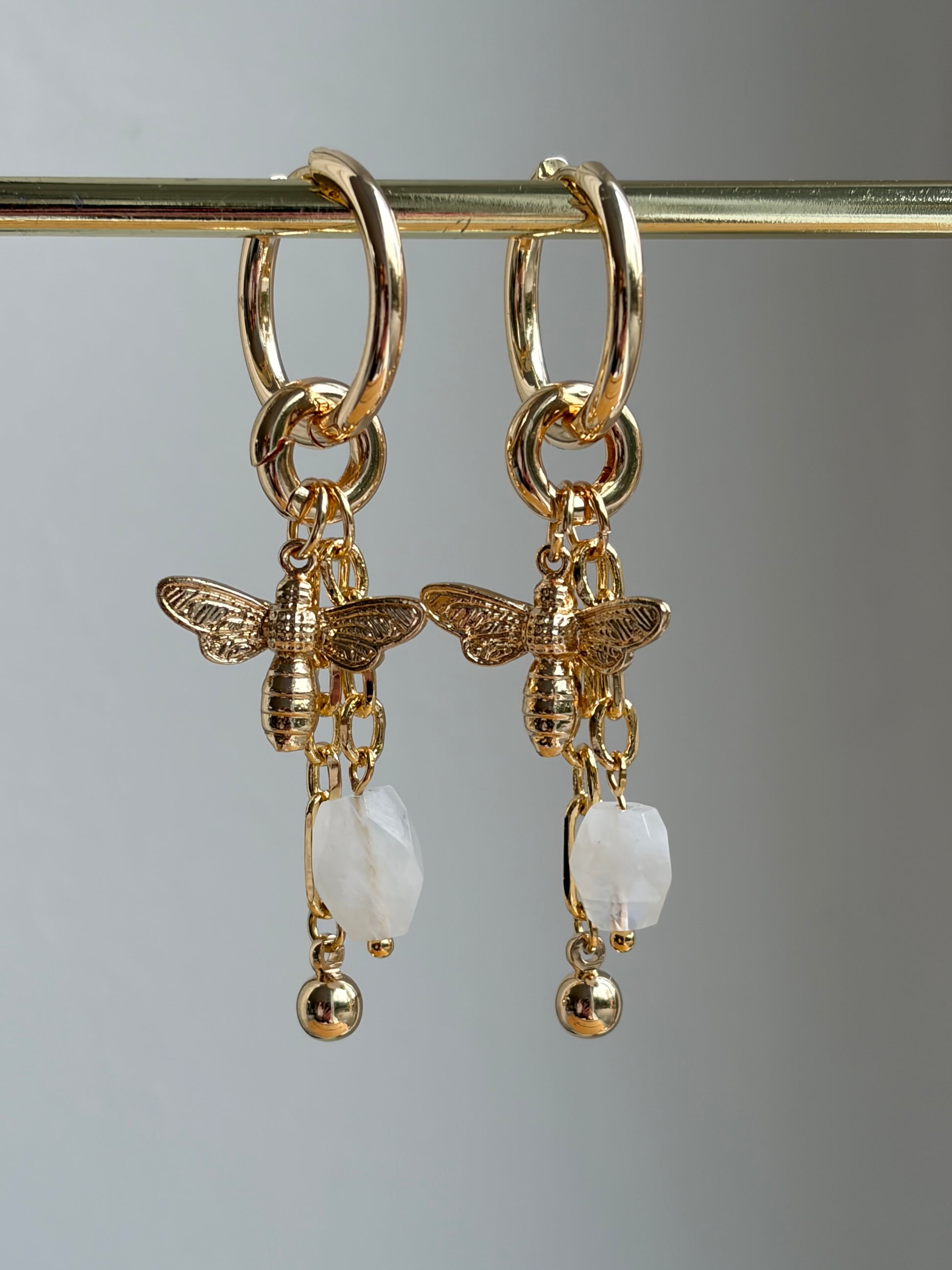 Verguld bijtje, wit Maansteentje en kettinkje met gouden bolletje aan een vergulde creool.