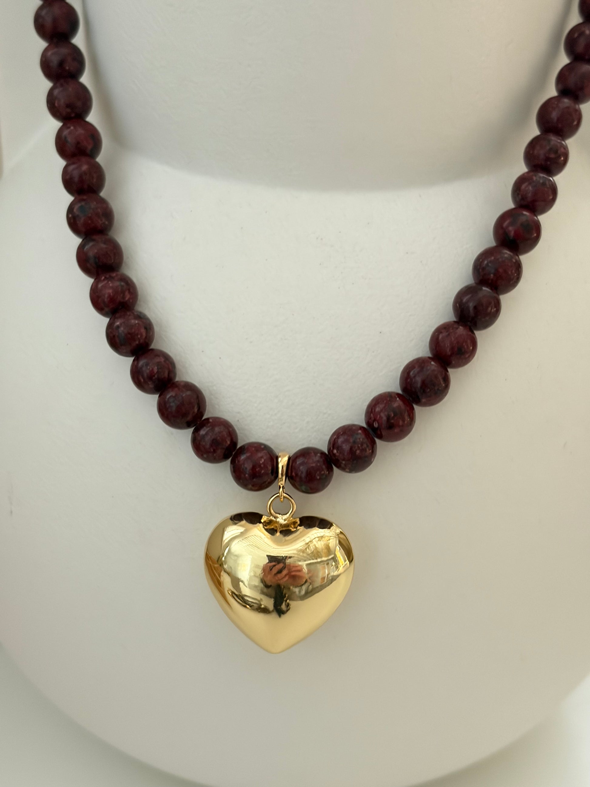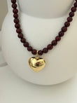Prachtige kralen ketting van Bordeaux kleurige natuurstenen kralen met een verguld hart. Er zit een klein verlengstukje aan de ketting.