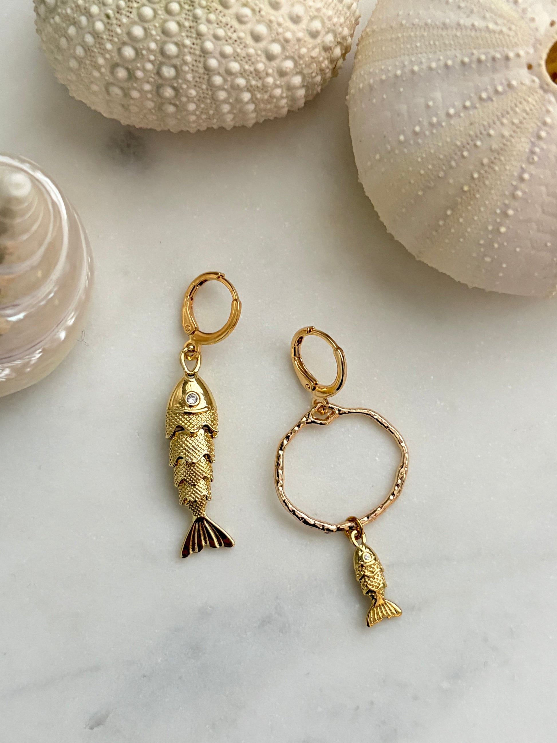 Vergulde grote vis en een klein visje aan een ring.