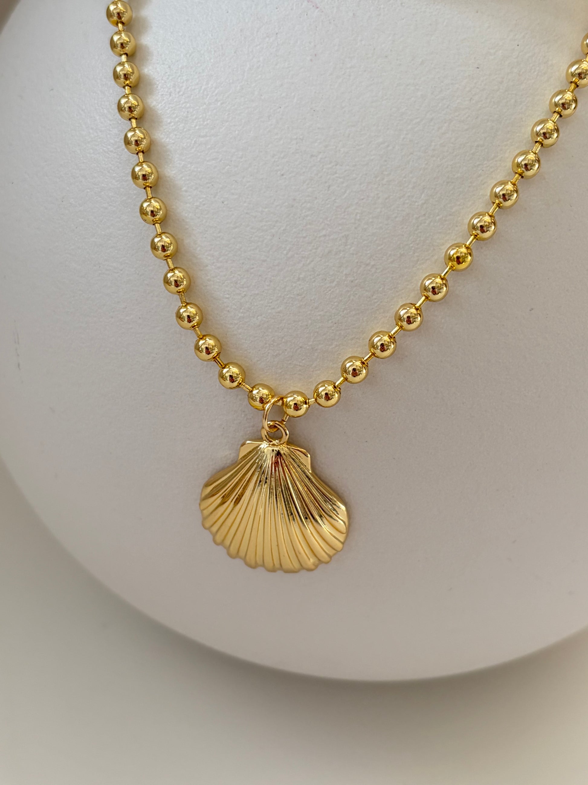 Vergulde bolletjes ketting met grote schelp. Ook leuk om te combineren met onze andere kettingen uit de Sea & Shell collectie.