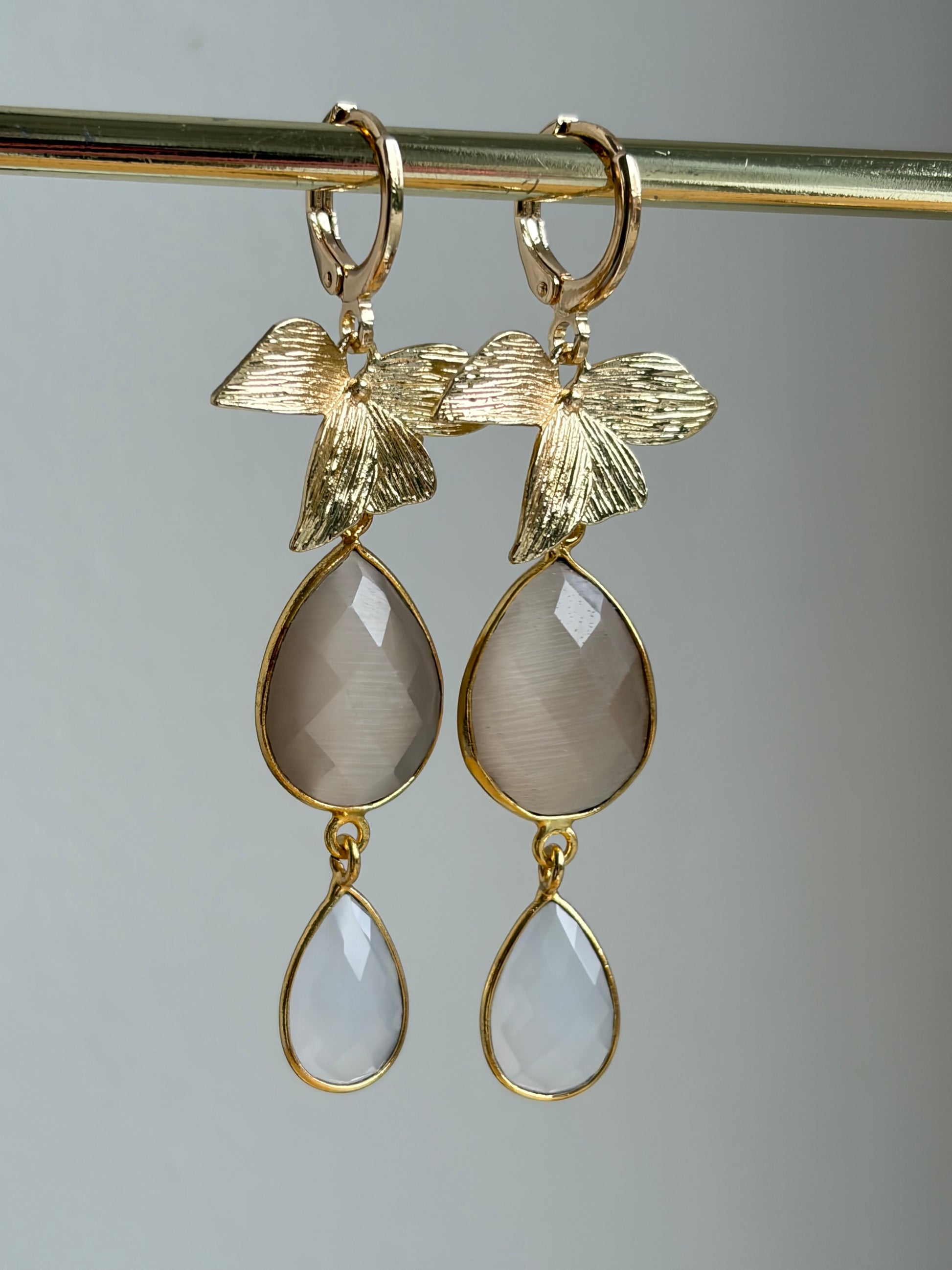 Beige Cateye druppel en wit Maansteen druppeltje aan een verguld bloemetje.
