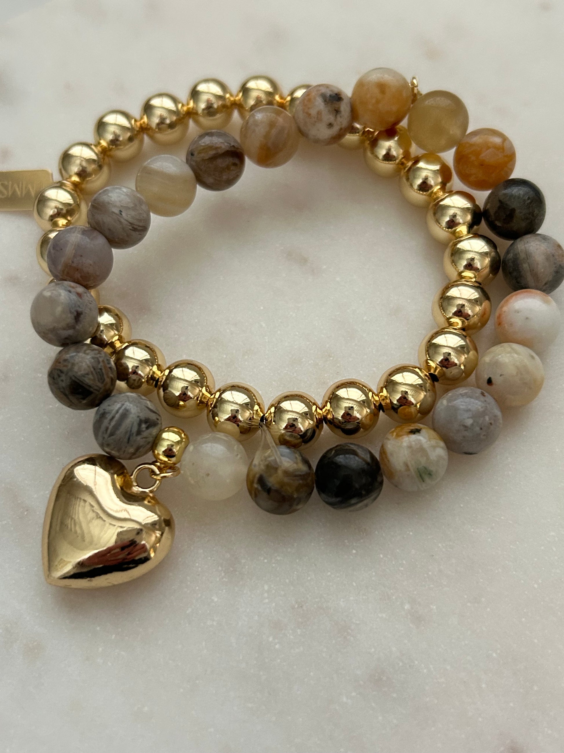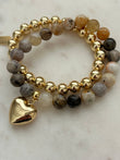 Armbandje met gemêleerde natuursteen kralen en groot verguld hart. Elastisch. 1 maat.