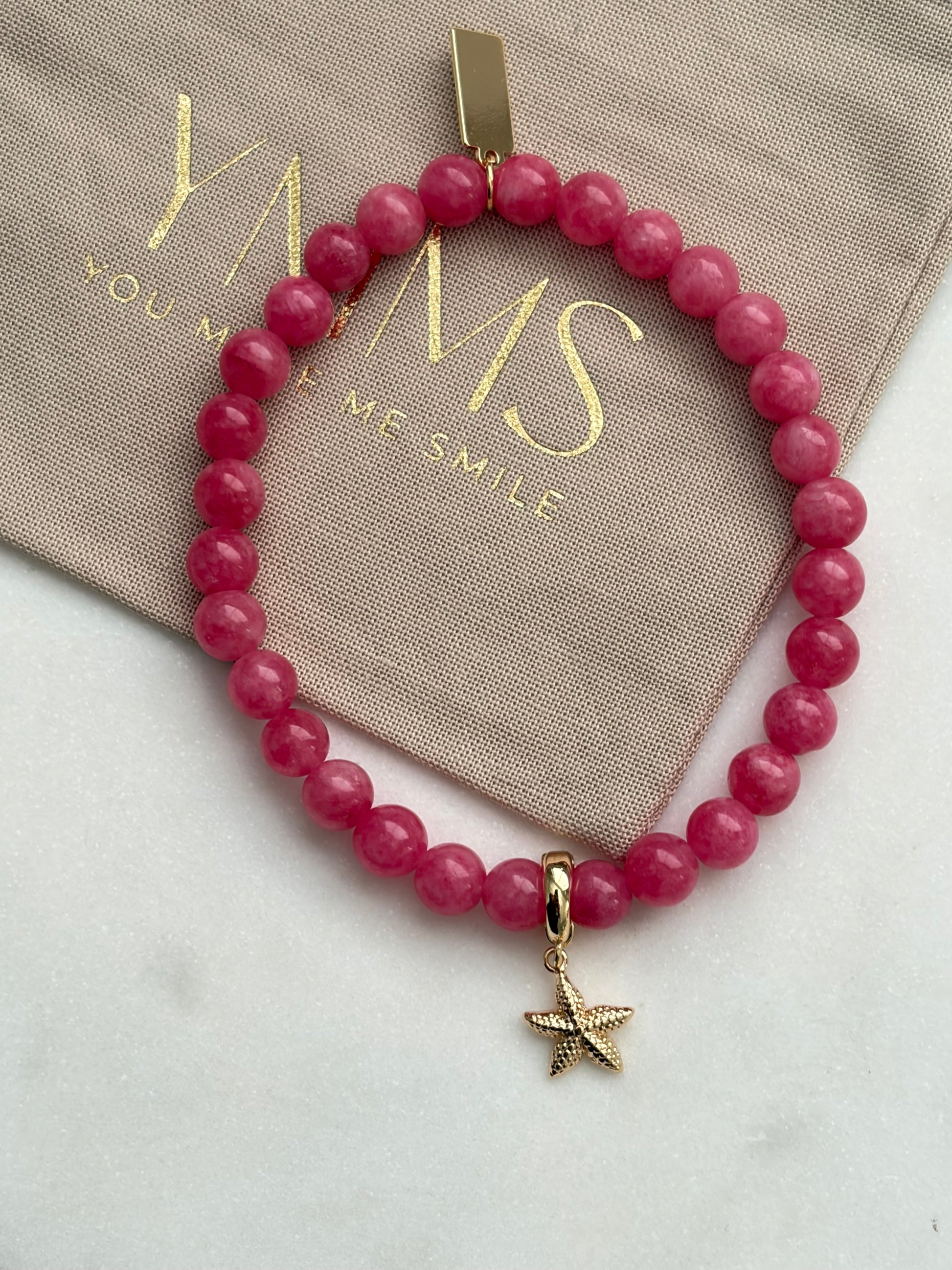 Armband van natuursteenkralen (Pink Jade) en kleine zeester bedel.
