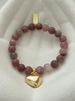 Armbandje met roze natuursteen kralen en groot verguld hart. Elastisch. 1 maat.