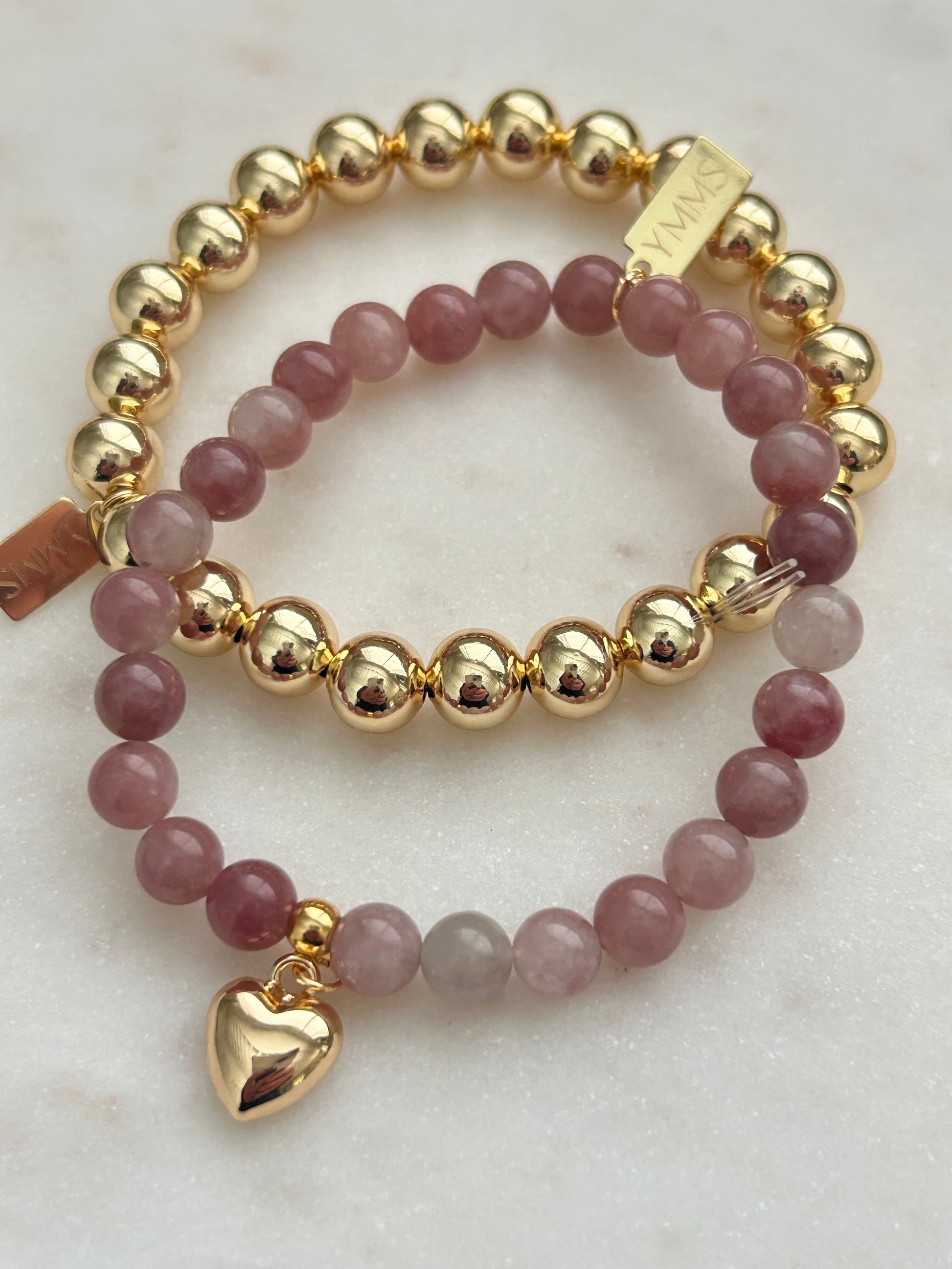 Prachtig armbandje van roze natuursteen kralen met verguld hartje. Elastisch. 1 maat.