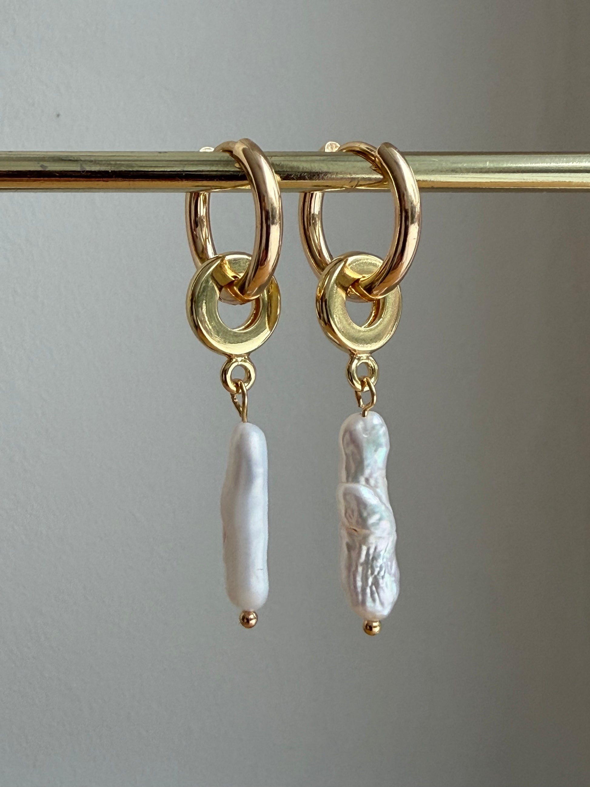 Prachtige langwerpige parel aan vergulde ringen.