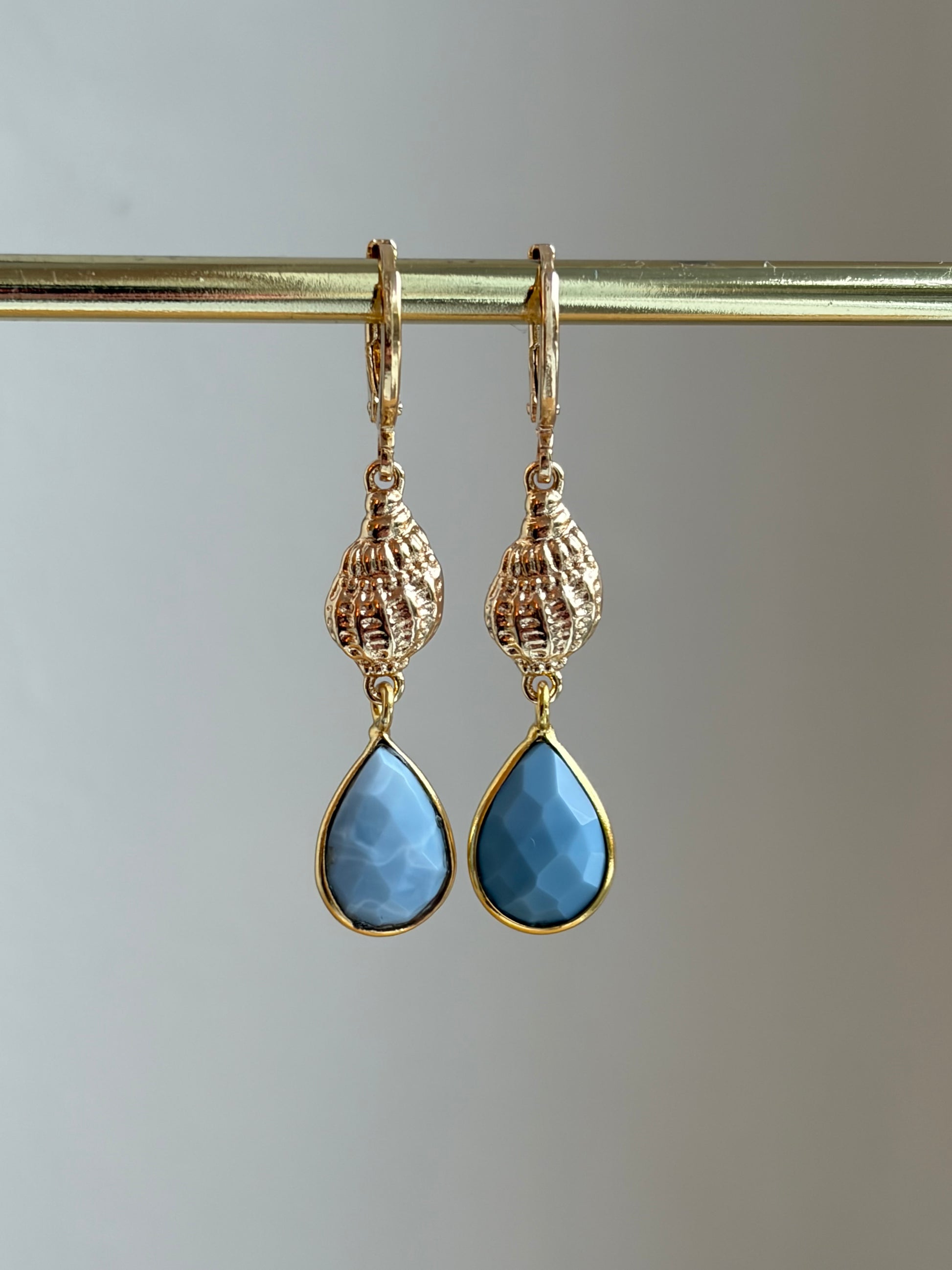 Blue Opal druppels aan kleine schelpjes.