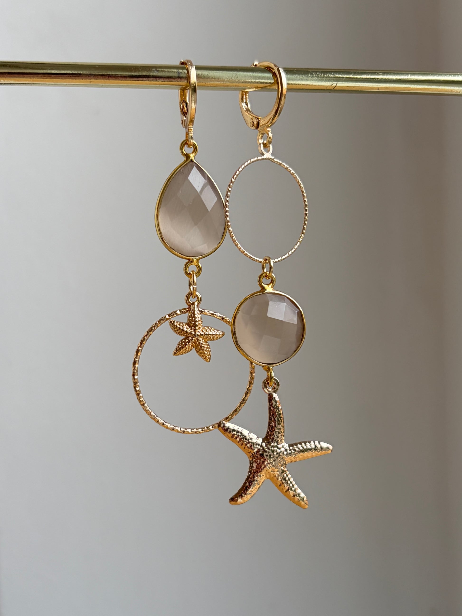 Beige Cateye gecombineerd met vergulde zeesterren. Deze oorbellen geven je outfit een subtiele zomersfeer.