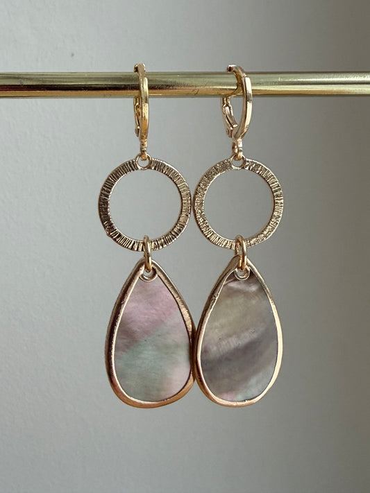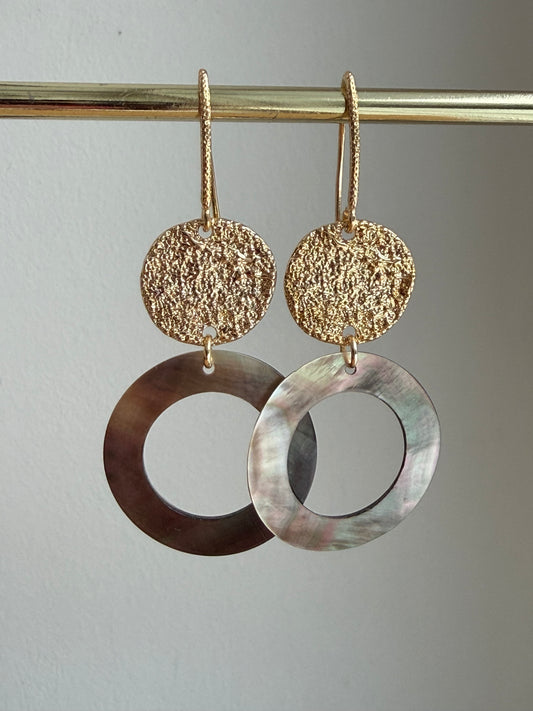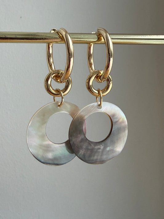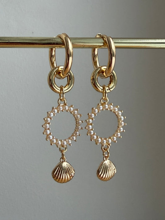 Schelpje aan een connector met pareltjes aan een vergulde creool.