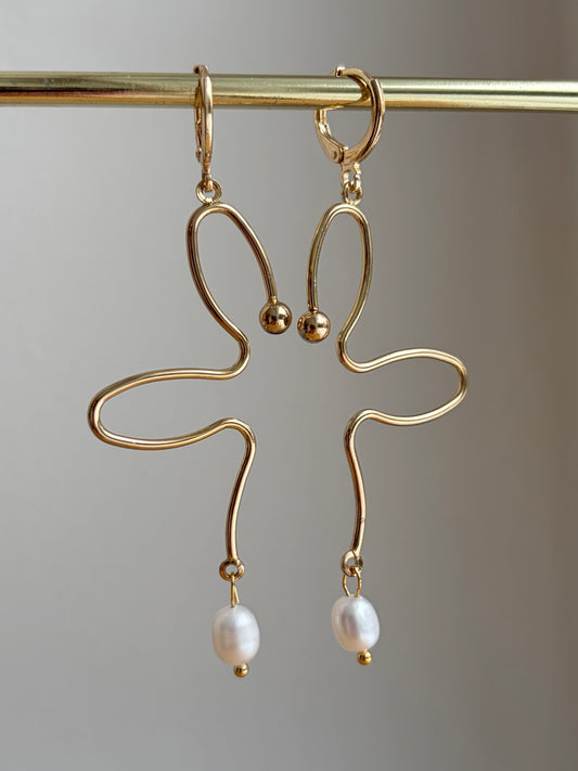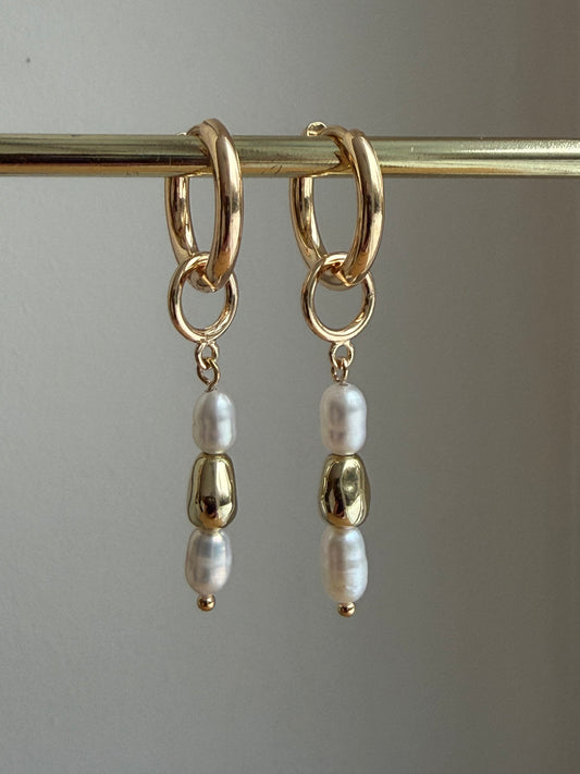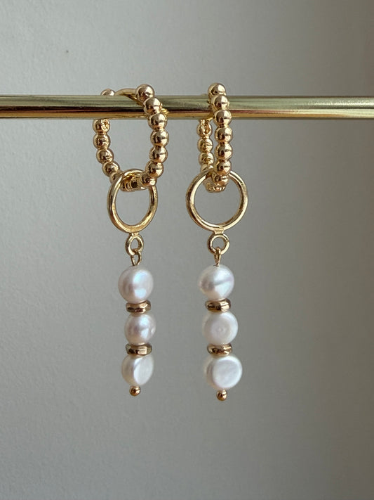 Parels en gouden kralen vormen een prachtige hanger aan deze creool.
