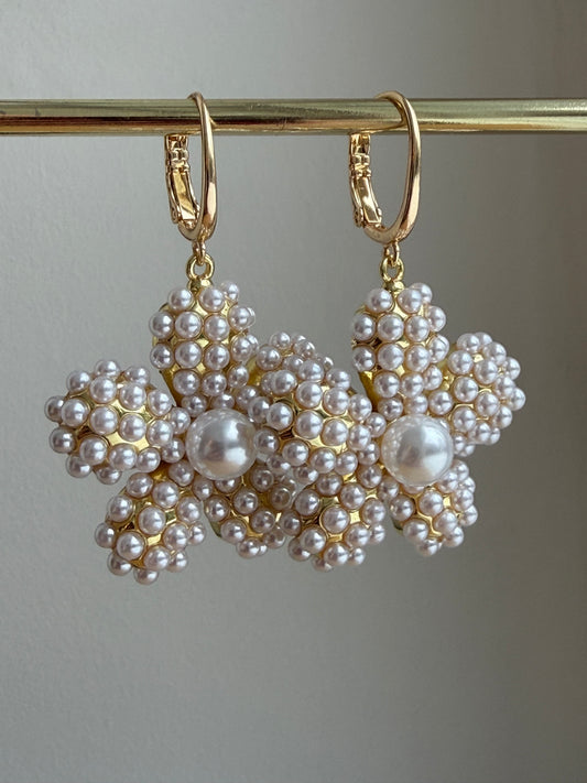 Wauw! Prachtige bloemhanger bestaande uit kleine pareltjes en 1 grote parel aan een vergulde creool. ...