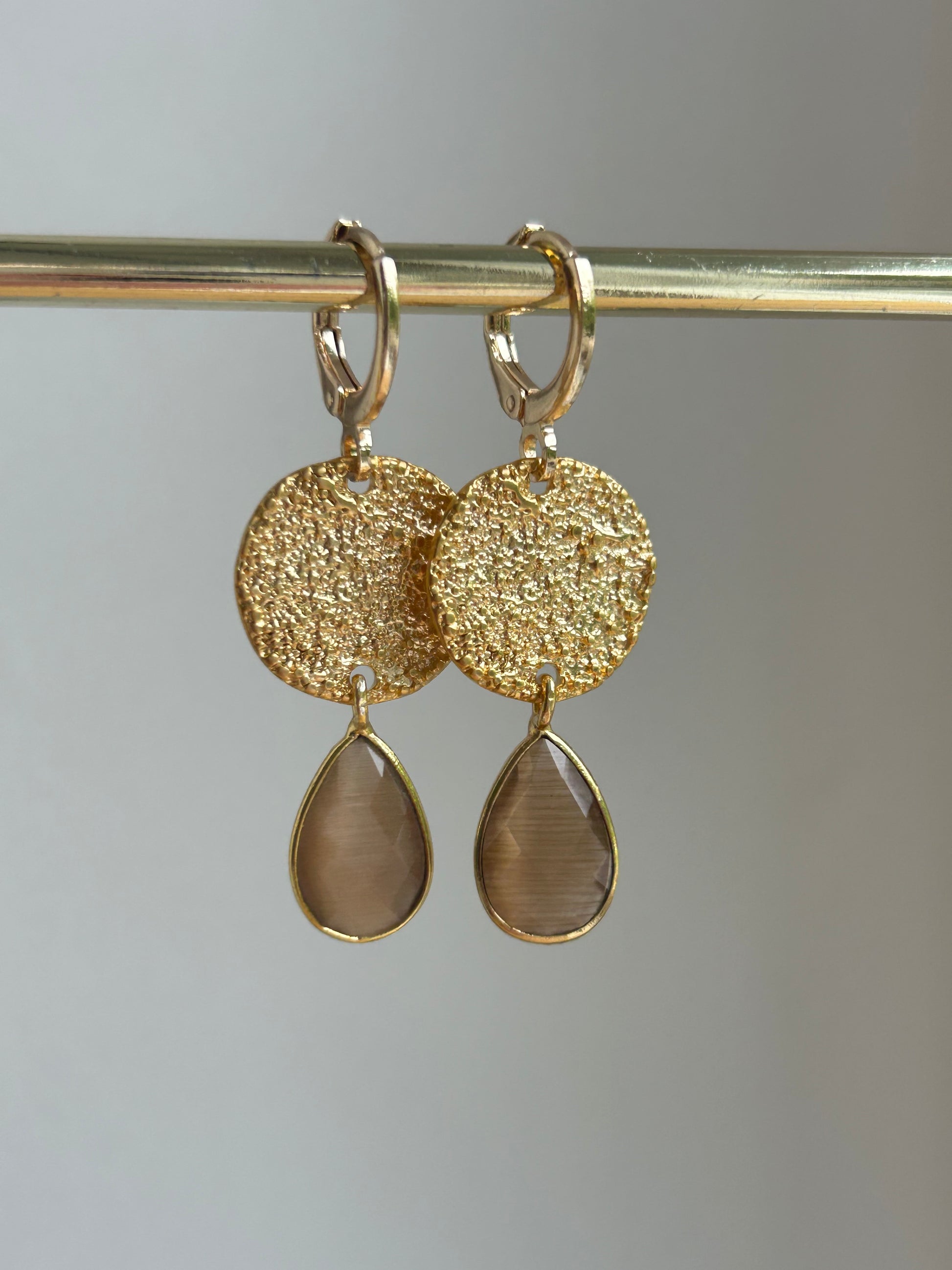 Kleine lichtbruine Cateye druppel aan een bewerkte hanger.
