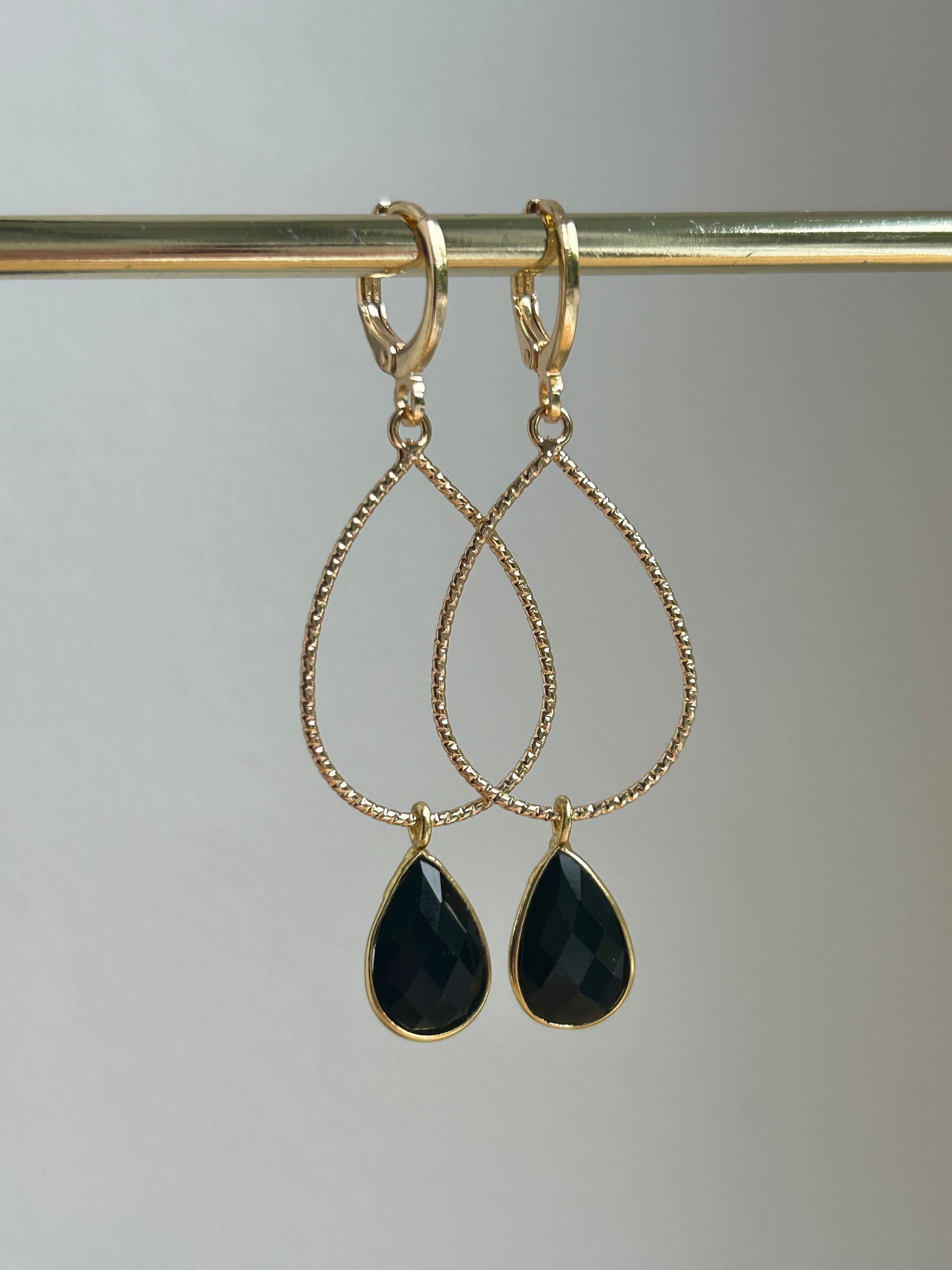 Deze elegante oorbellen bestaan uit een glanzende Onyx druppel die bungelt aan een open vergulde vorm. Het geheel hangt aan een fijne creool en wiebelt licht mee bij iedere beweging.
