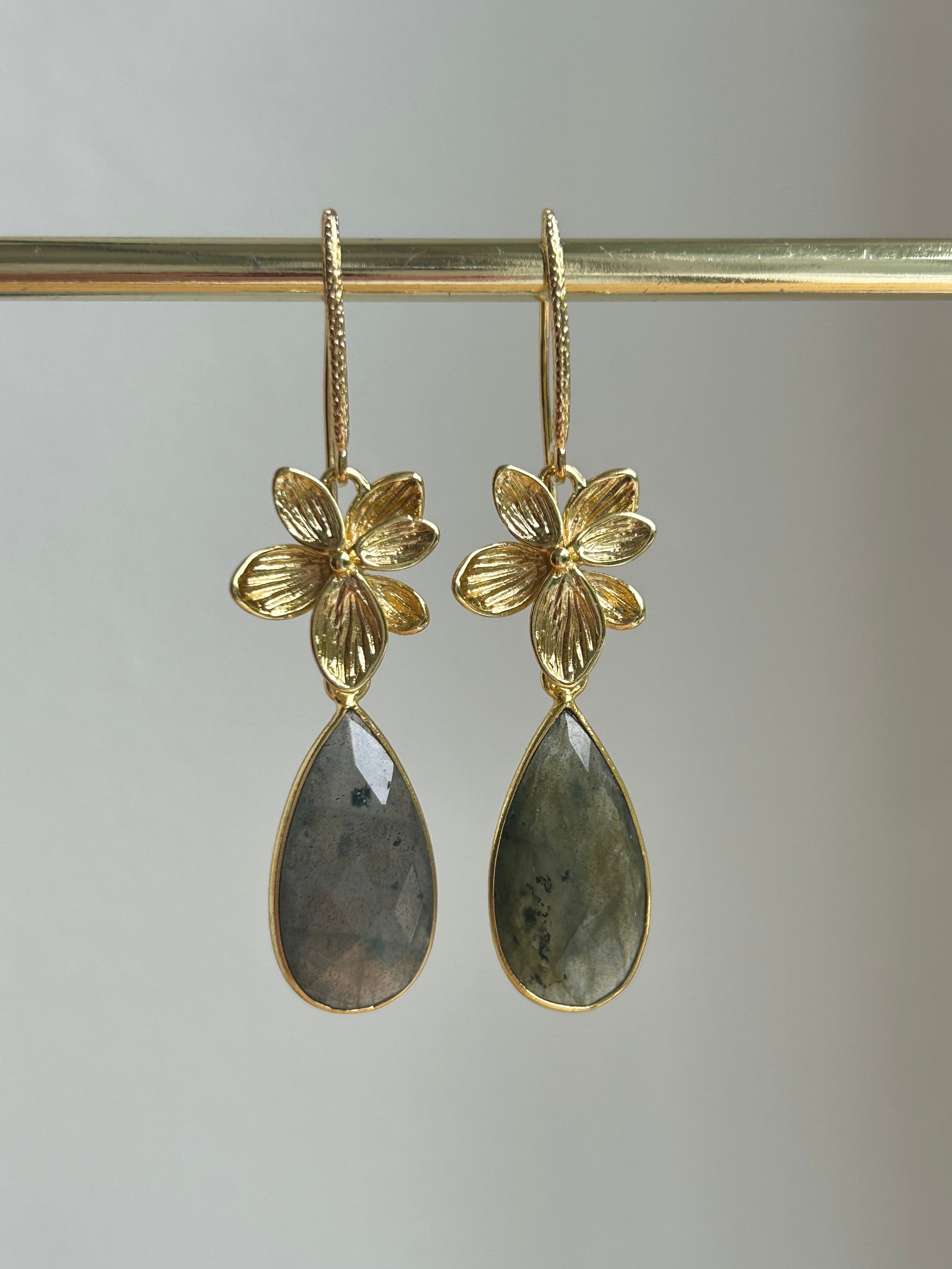 Labradoriet druppel aan een verguld bloemetje en haakje.