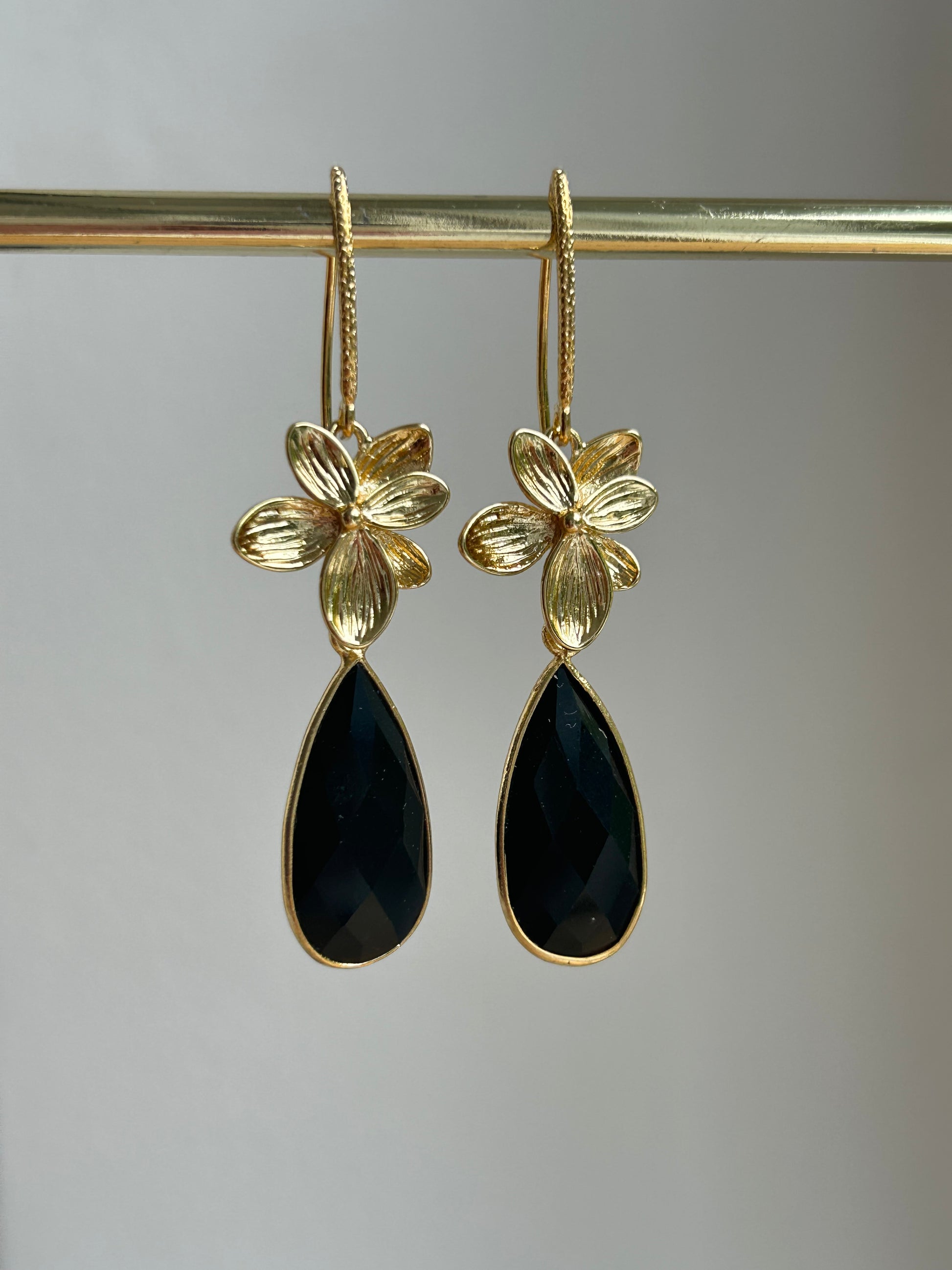 Black Onyx druppel aan een verguld bloemetje en haakje.