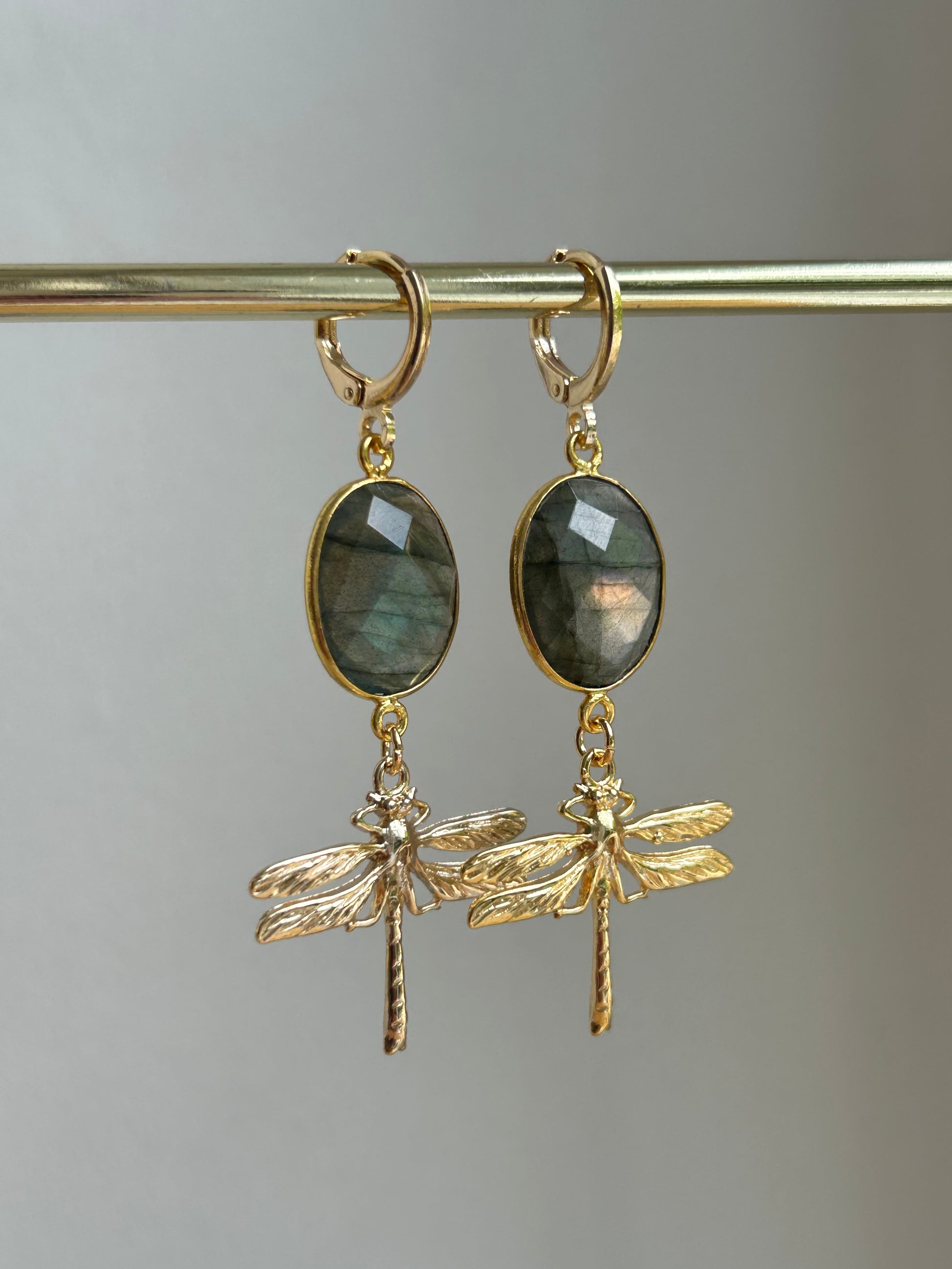 Deze vergulde creooltjes zijn voorzien van een ovale labradoriet steen met daaronder een gedetailleerde libellehanger. Labradoriet staat bekend om haar mysterieuze kleurenspel, dat bij elke beweging licht vangt.