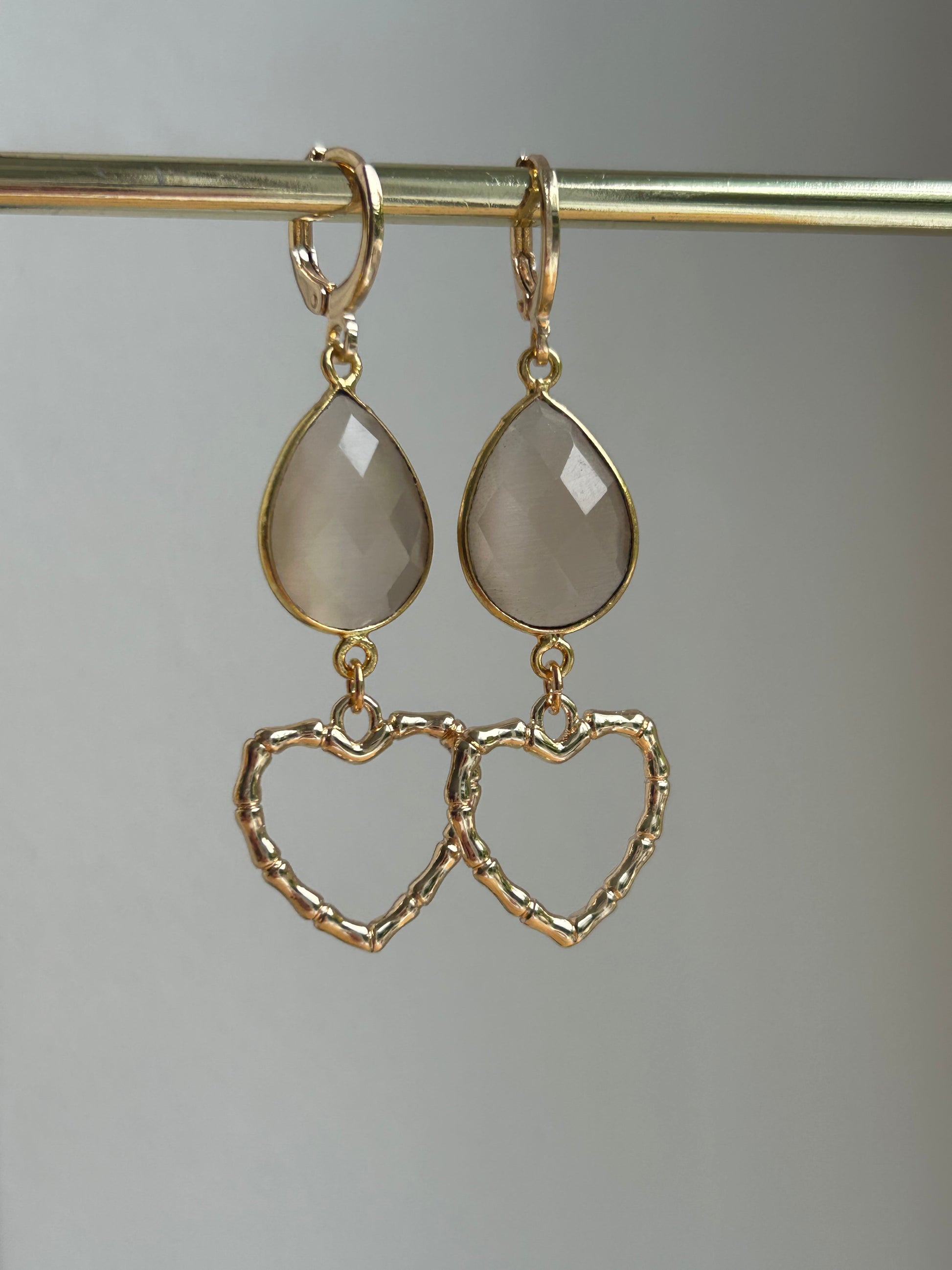 Prachtige beige Cateye druppel met een verguld hartje aan een creooltje.