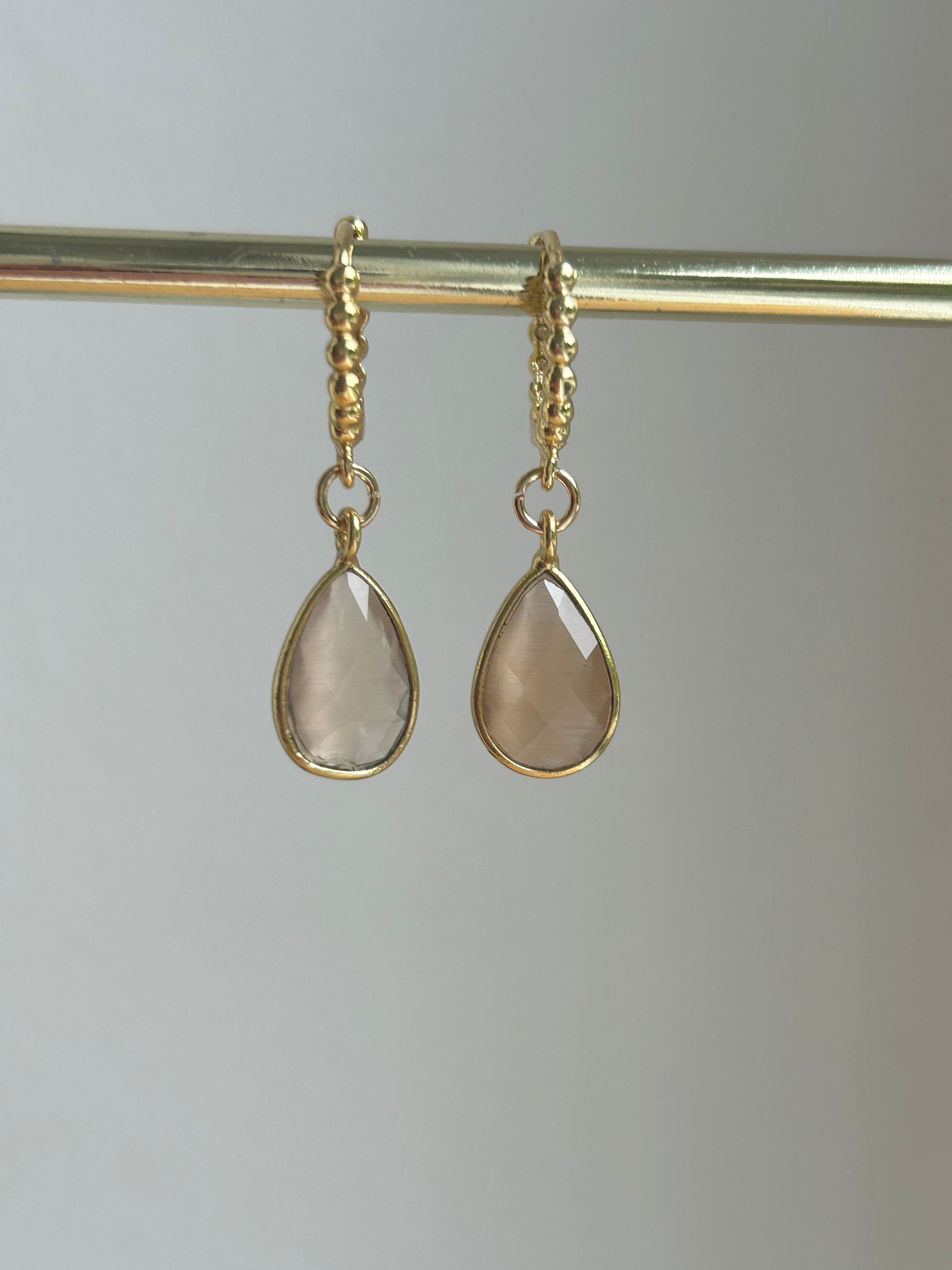 Klein beige Cateye druppeltje aan een verguld creooltjes met bolletjes.