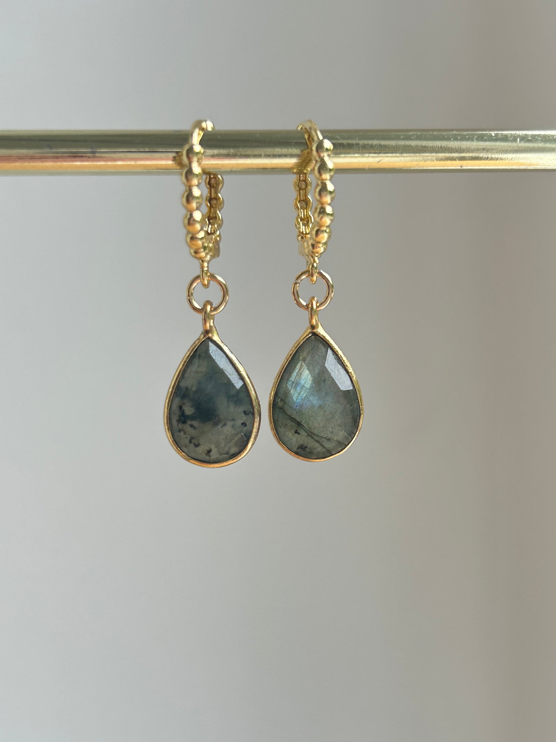 Klein Labradoriet druppeltje aan een verguld creooltjes met bolletjes.
