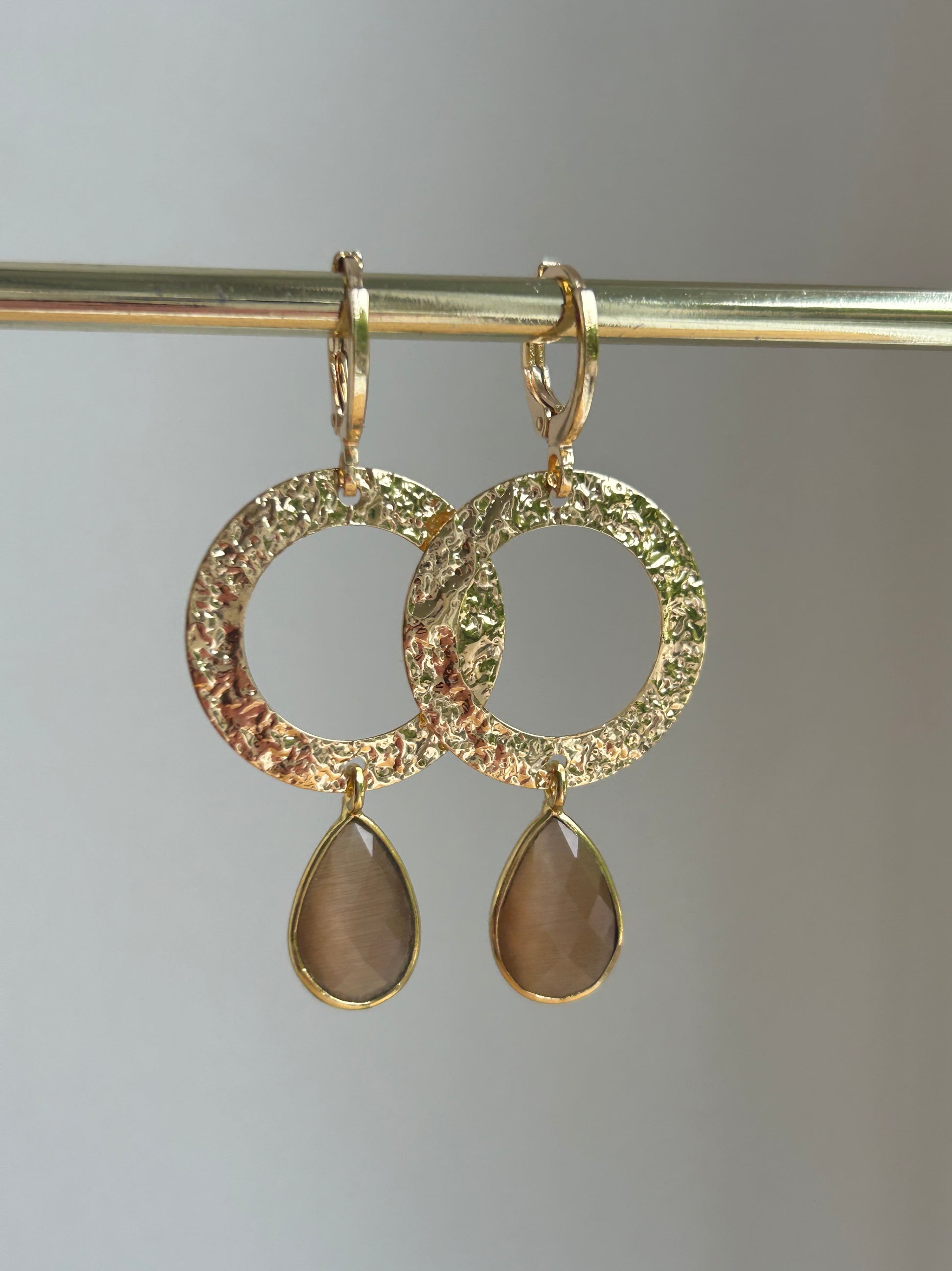 Kleine bruine Cateye druppel aan een bewerkte hanger.