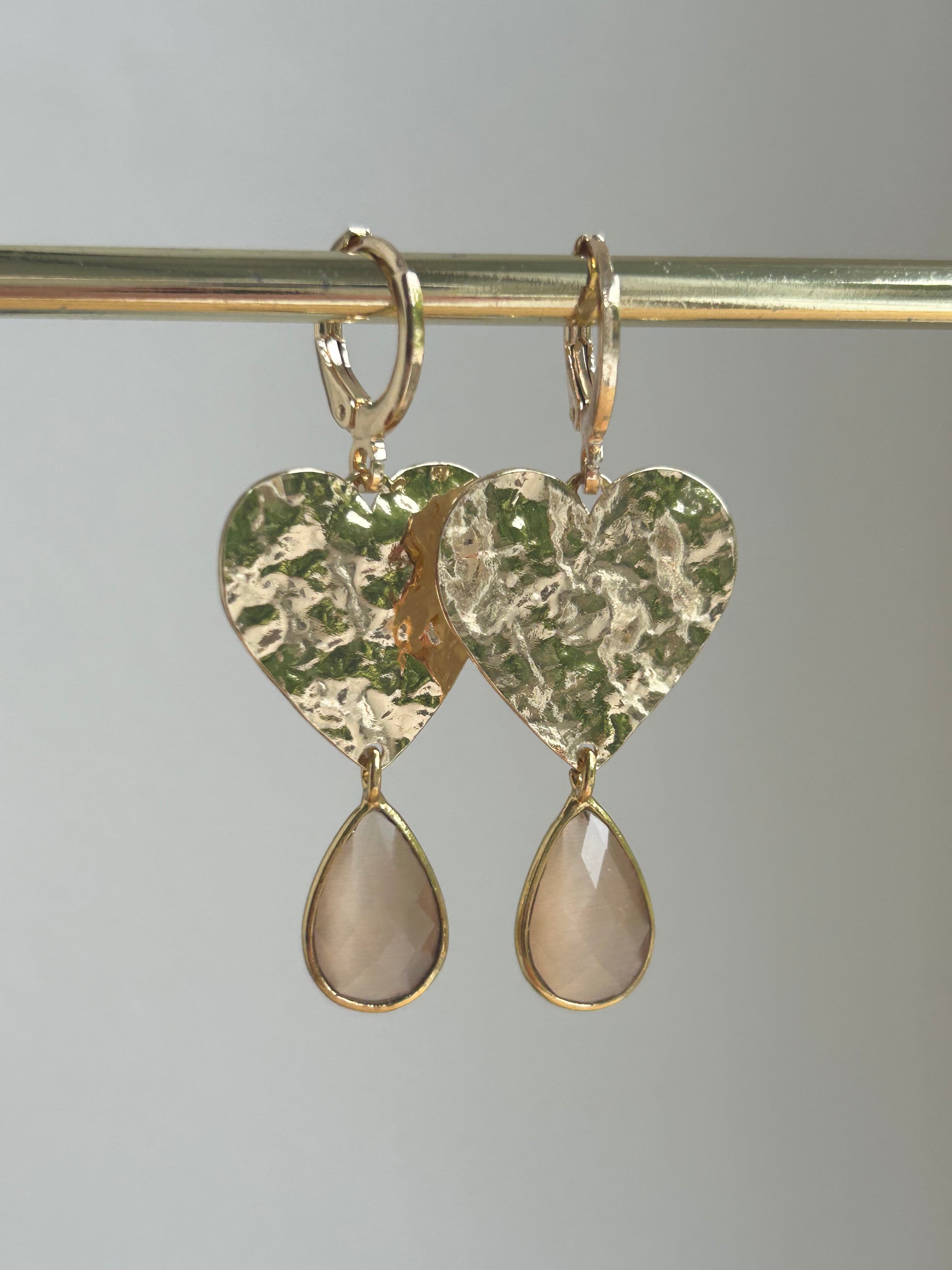 Deze elegante oorbellen combineren de organische charme van gehamerd metaal met de zachte uitstraling van beige Cateye. Het hartvormige ontwerp voegt een speelse romantiek toe, terwijl de mooie beige druppelsteen zorgt voor een warme, opvallende touch.