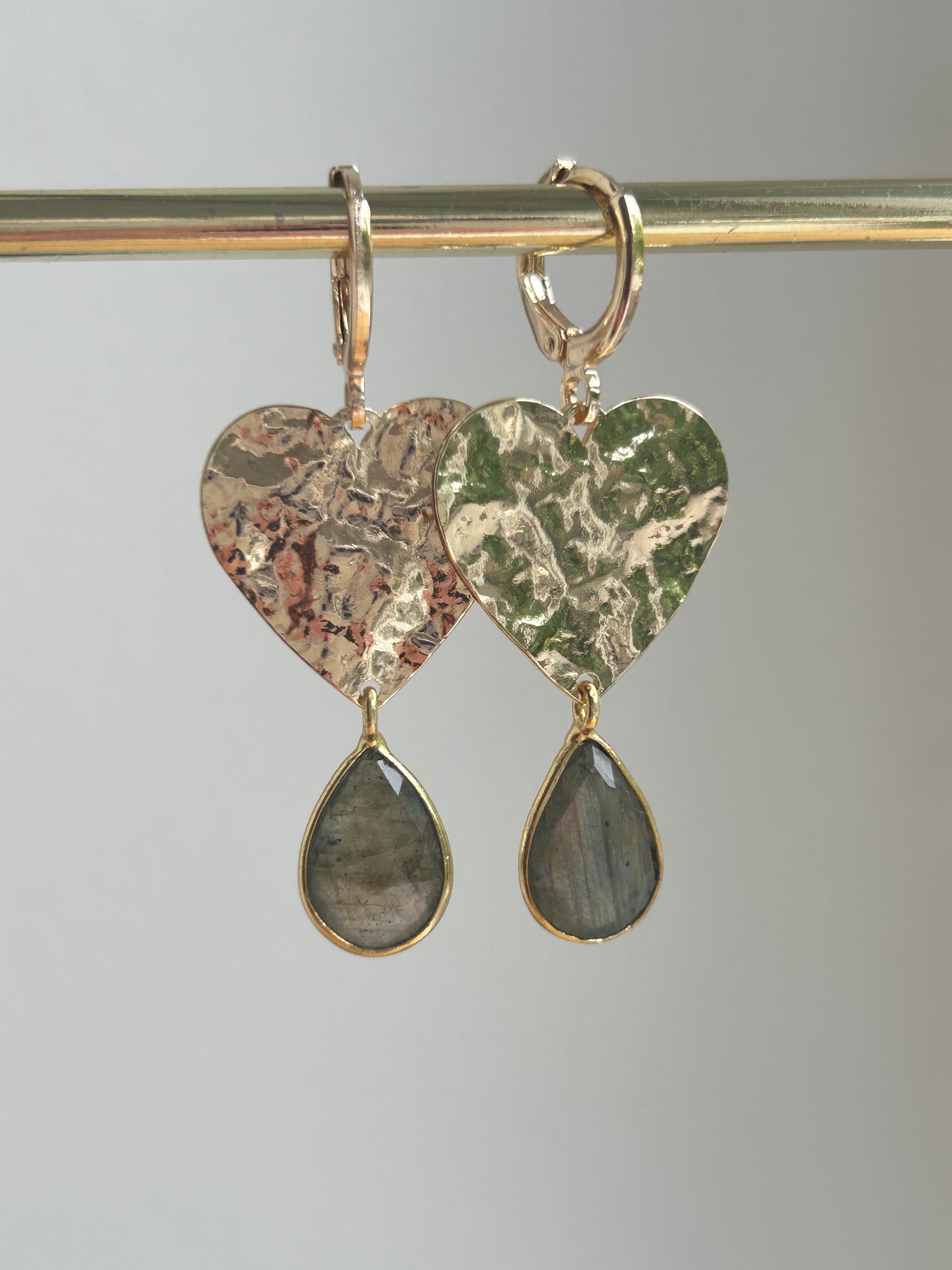 Deze elegante oorbellen combineren de organische charme van gehamerd metaal met de mysterieuze uitstraling van Labradoriet.  Het hartvormige ontwerp voegt een speelse romantiek toe, terwijl de mooie Labradoriet druppelsteen zorgt voor een mystieke, opvallende touch.
