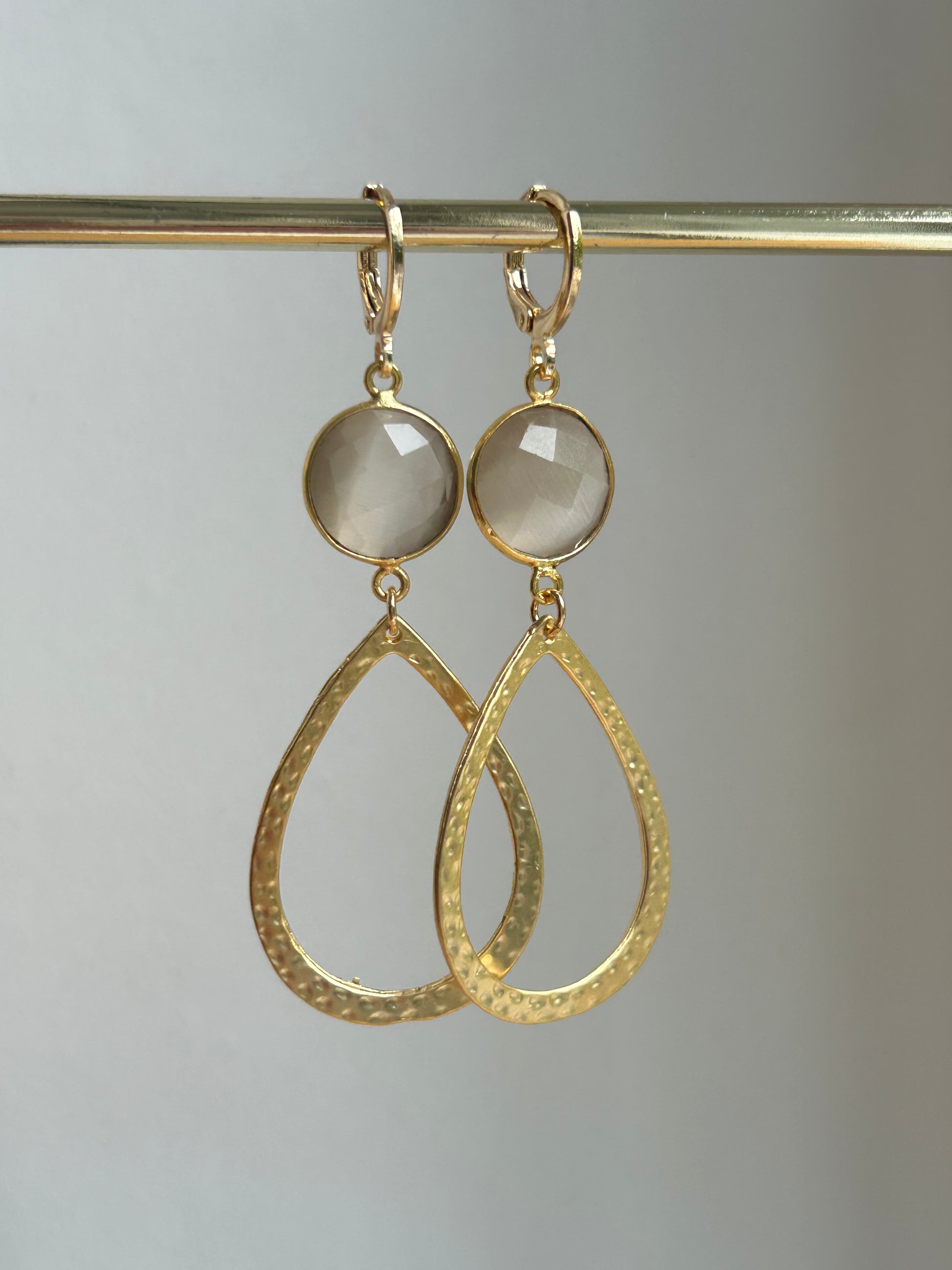 Deze opvallende oorbellen combineren de mysterieuze glans van Cateye met een elegante open druppelvorm in verguld metaal. De gefacetteerde steen vangt het licht prachtig op en zorgt voor een subtiele kleurschakering. Perfect voor wie houdt van unieke, natuurlijke accenten met een gouden touch.