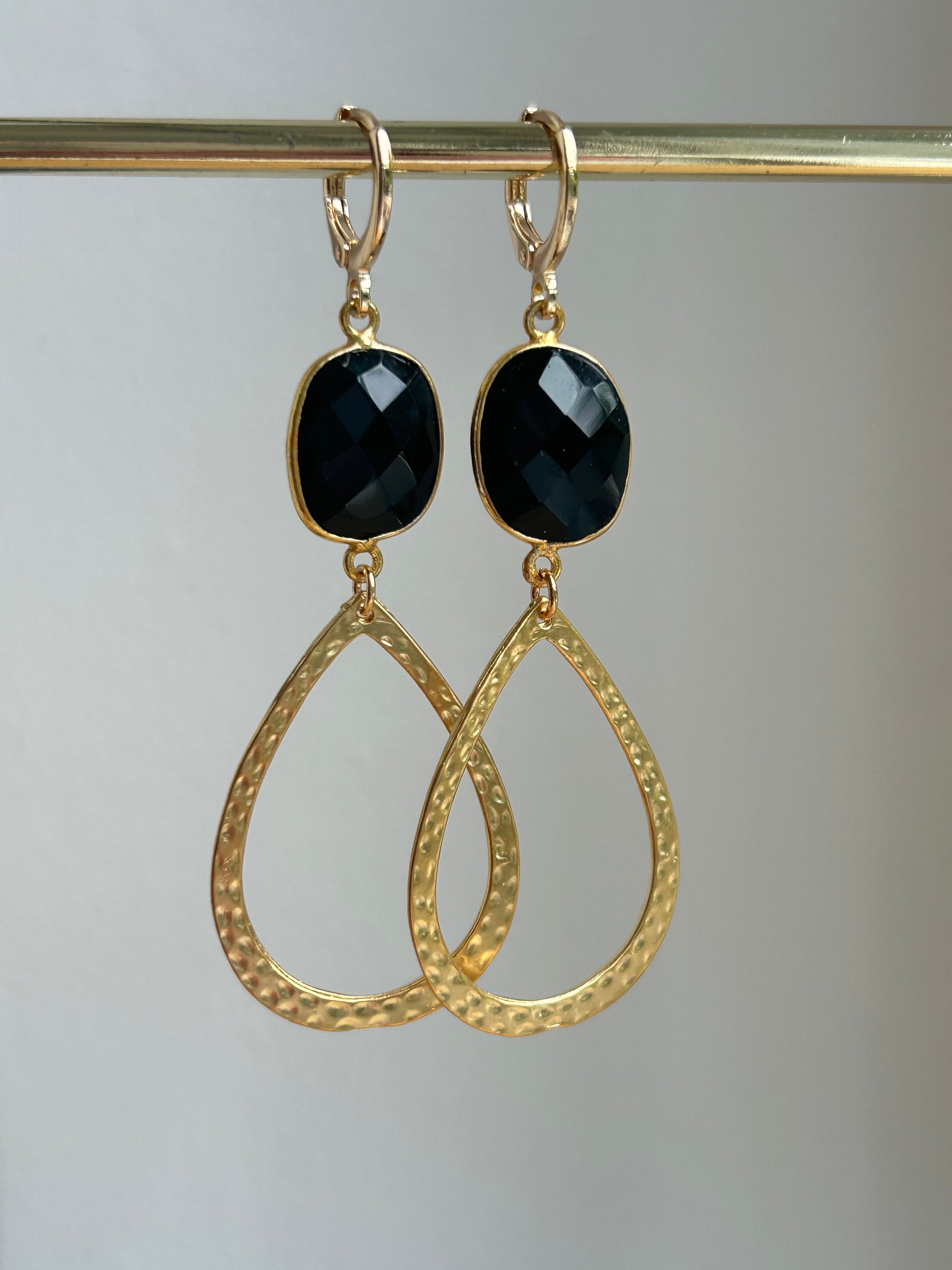 Deze opvallende oorbellen combineren de mysterieuze glans van Black Onyx met een elegante open druppelvorm in verguld metaal. De gefacetteerde steen vangt het licht prachtig op en zorgt voor een subtiele kleurschakering. Perfect voor wie houdt van unieke, natuurlijke accenten met een gouden touch.