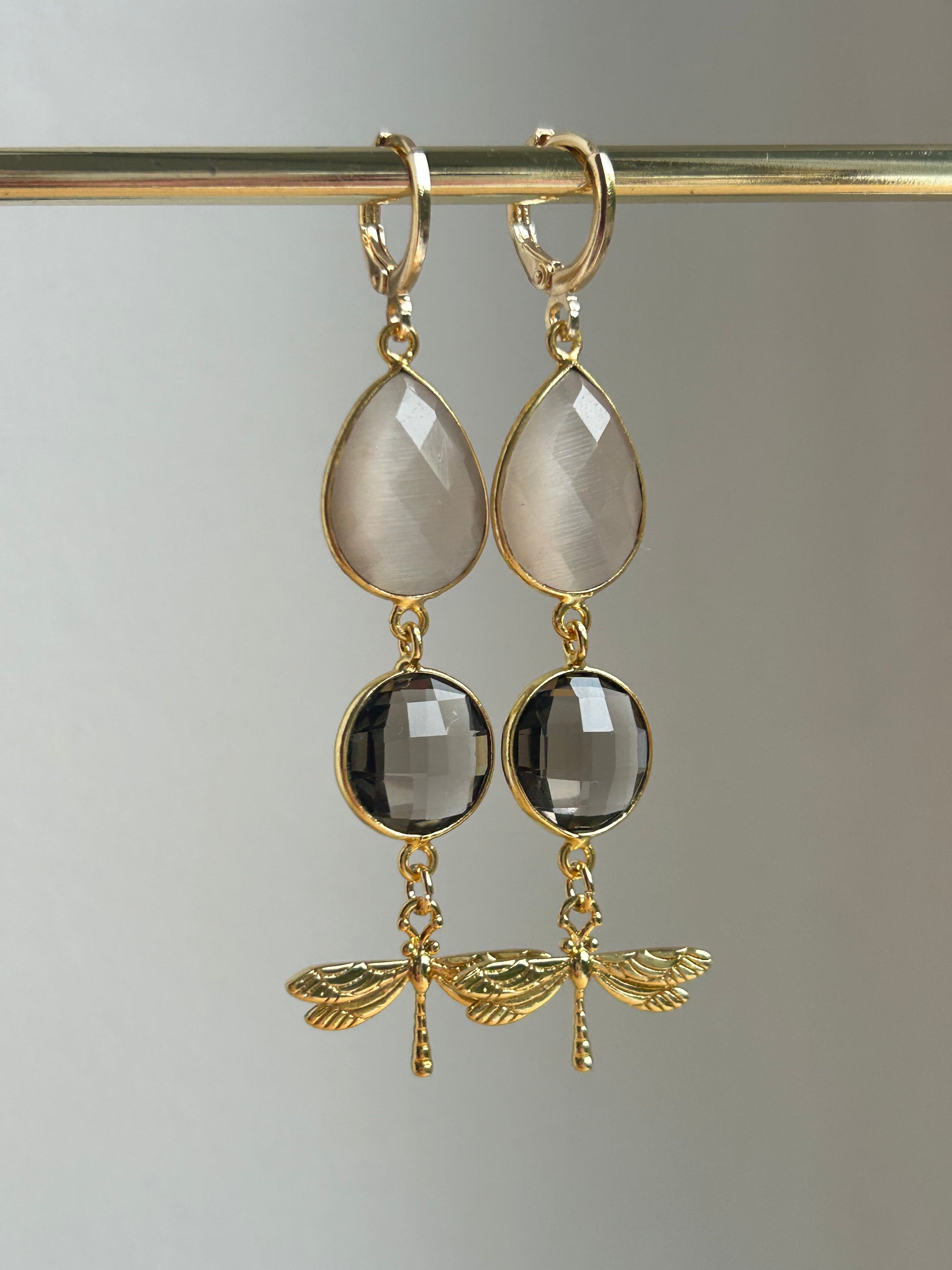 Beige Cateye druppel en bruine Rookkwarts steen met vergulde Libelle.