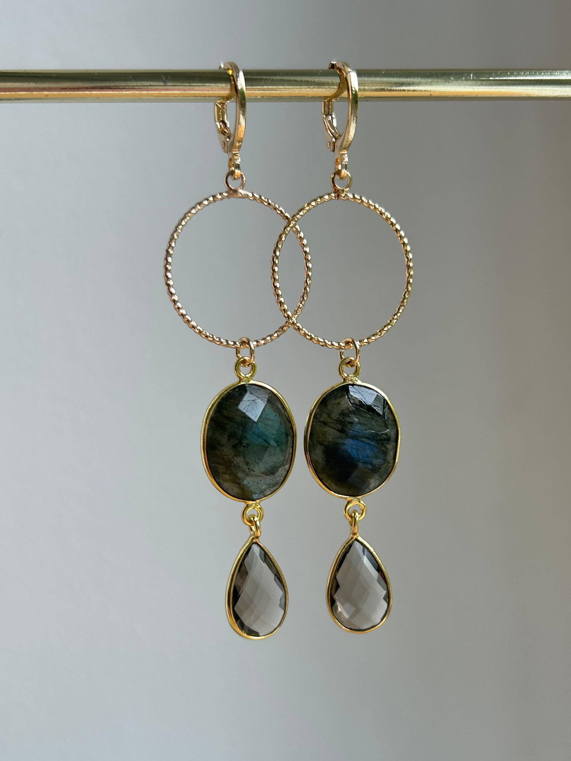 Labradoriet steen en bruin Rookkwarts druppeltje aan een cirkelvormige hanger.