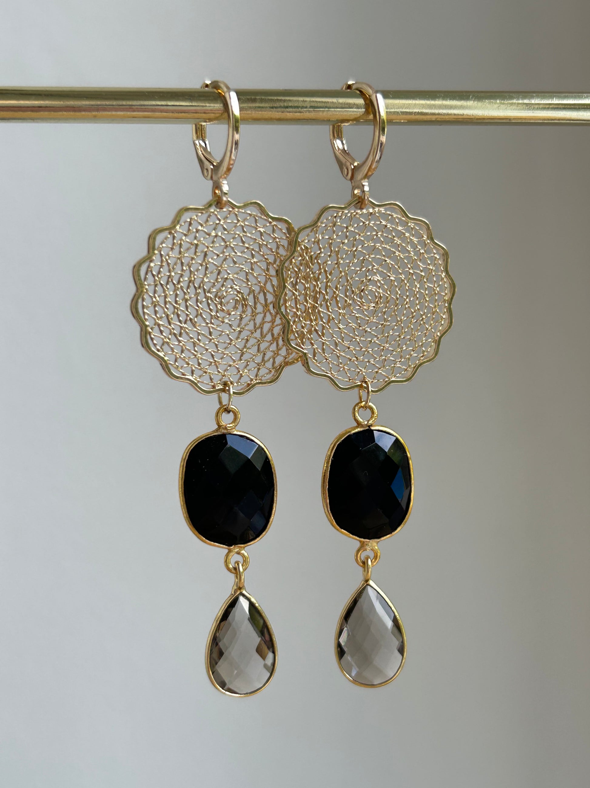 Zwarte Onyxsteen en bruin Rookkwarts druppeltje aan een mandala hanger.