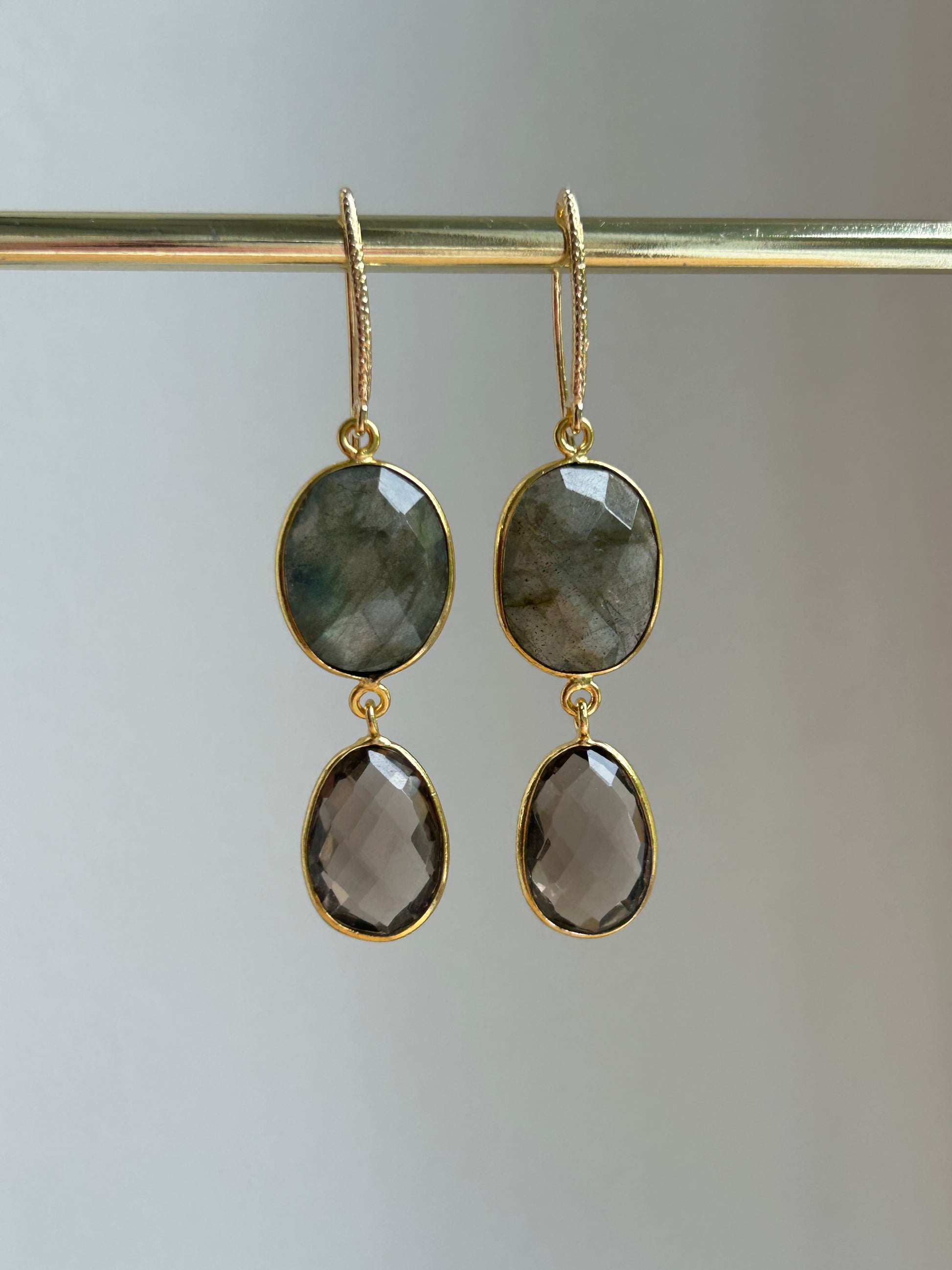 Labradoriet steen en bruine Rookkwarts steen aan een verguld haakje.