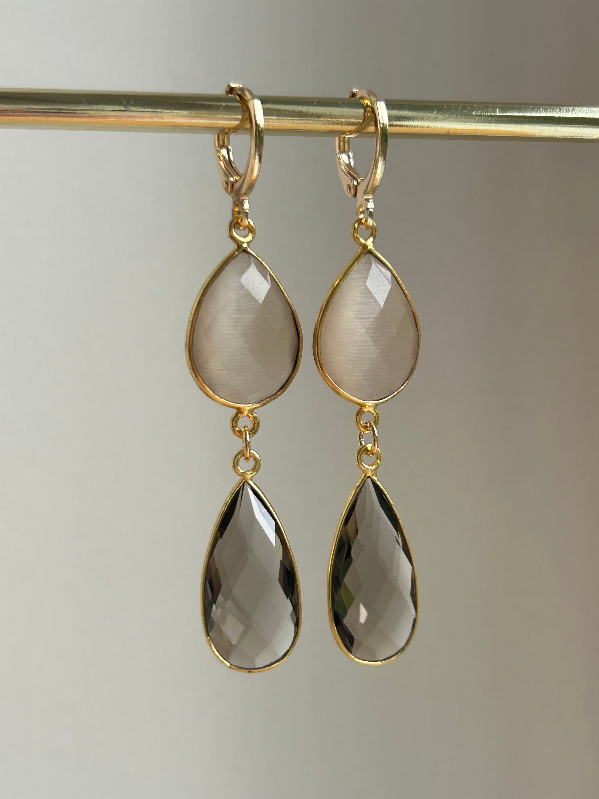 Bruine Rookkwarts druppel aan een beige Cateye druppel.