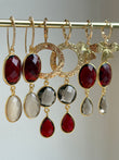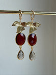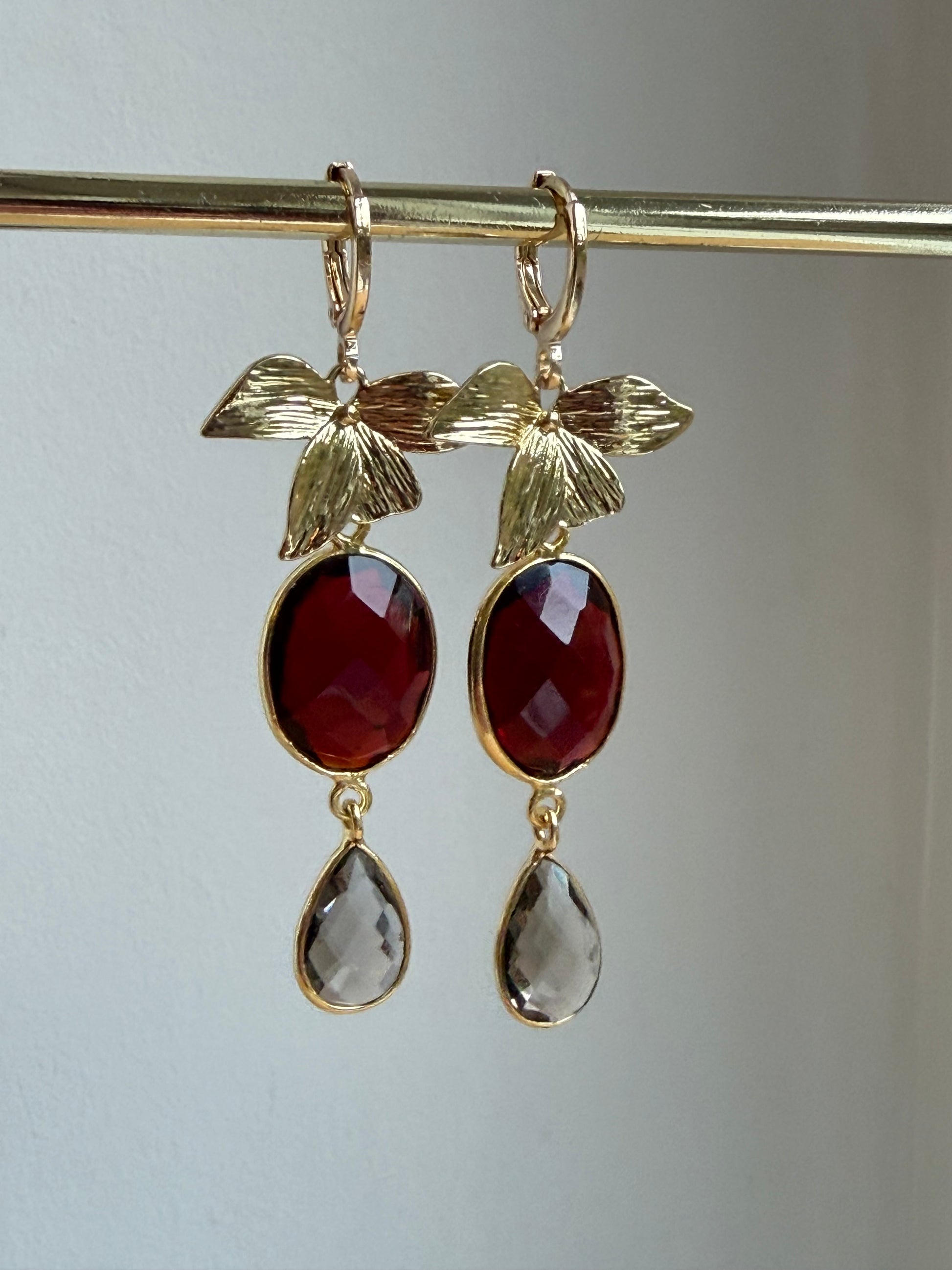 Bordeauxkleurige Granaatsteen met bruine Rookkwarts druppel aan een verguld bloemetje.