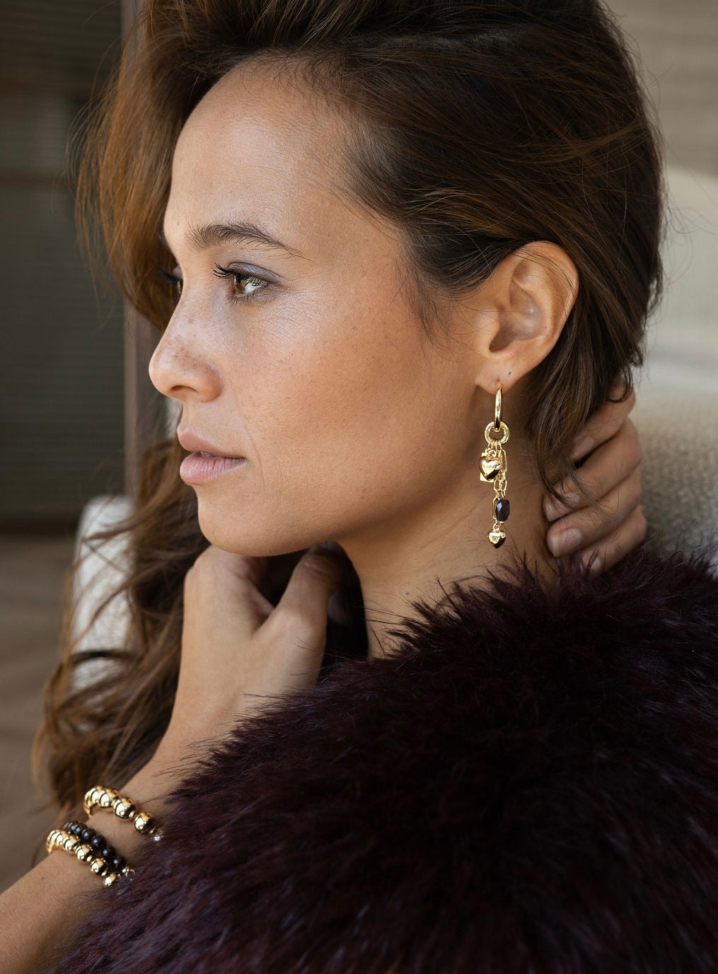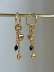 Vergulde creolen met vergulde hartjes en een bruin natuursteentje.