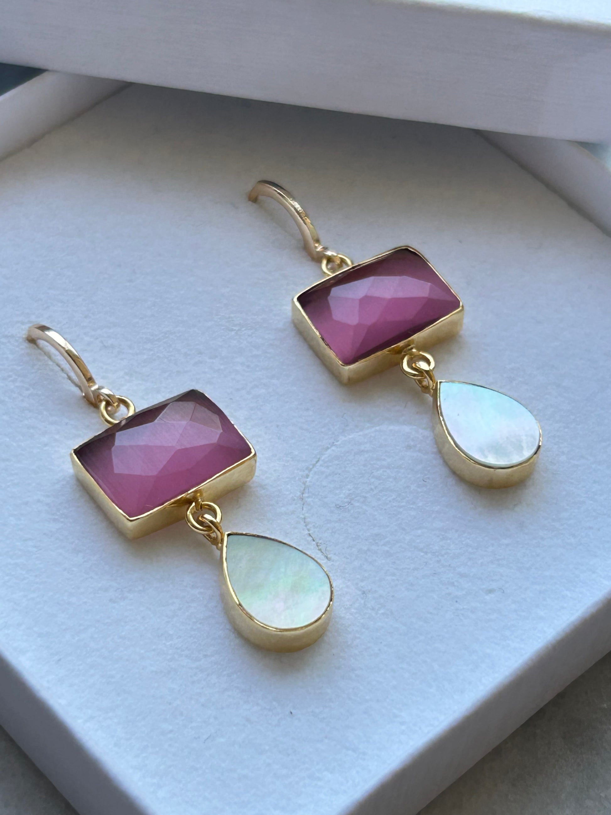 De Zaïre oorbellen stralen zachte elegantie uit dankzij de combinatie van een rechthoekige roze Cateye steen en een subtiele parelmoer druppel. Het warme vergulde creooltjemaakt het geheel af met een vleugje luxe. De perfecte mix van glans, kleur en verfijning.